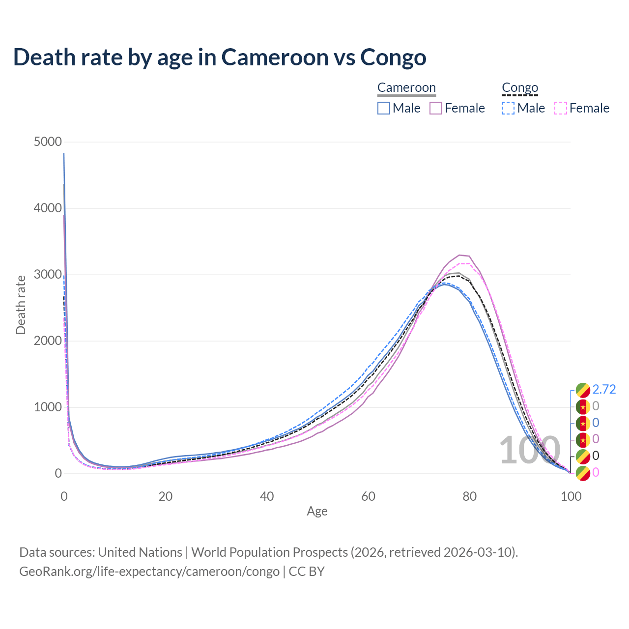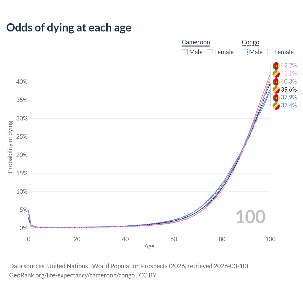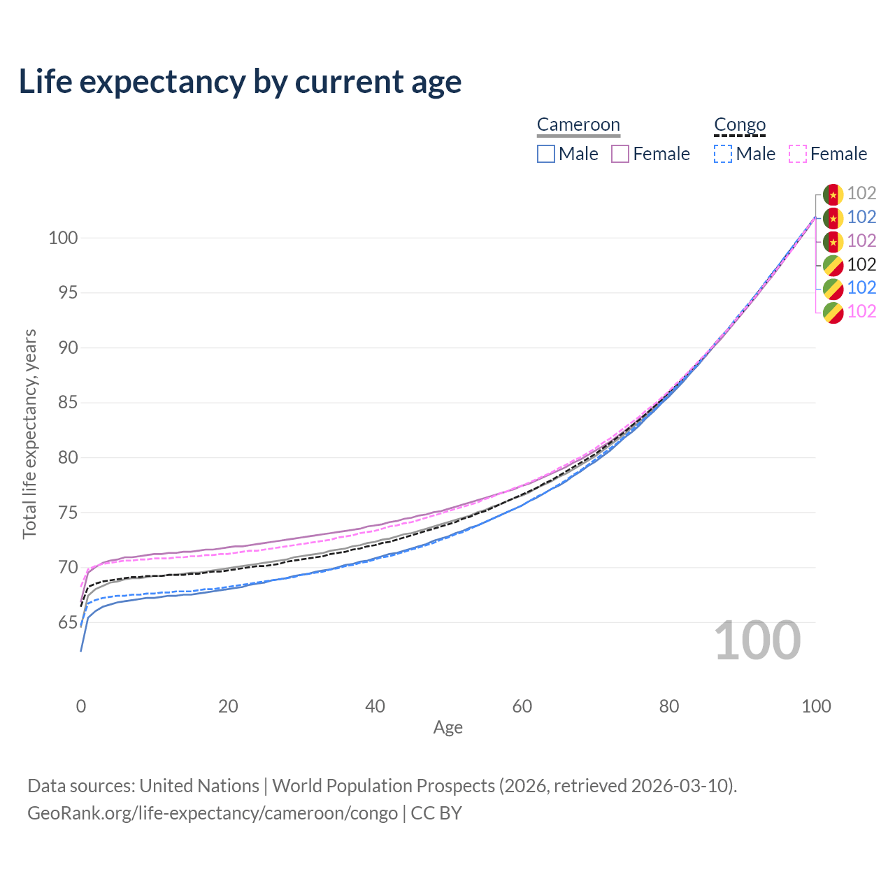 This life expectancy calculator shows the odds of living to 100, 95, 90, and below based on current age for both males and females in Cameroon and the Congo, along with mean and median age of death. The calculations are based on the 2026 life tables (actuarial tables) from the UN World Population Prospects.