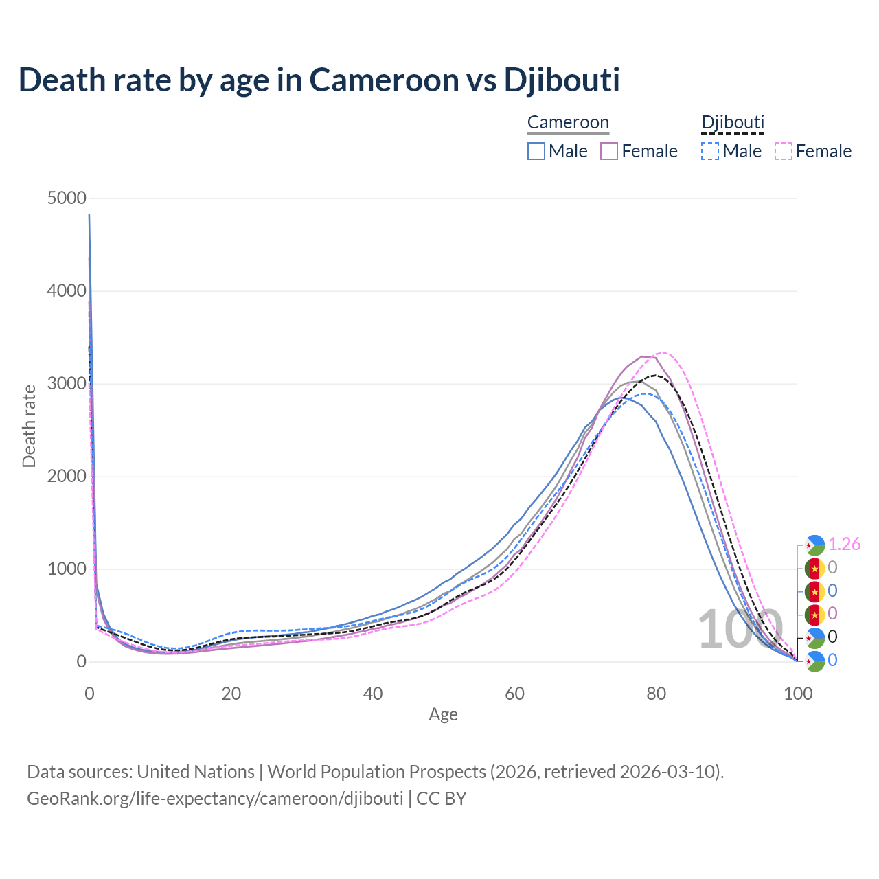 In Cameroon, the most common age of death is 0, compared to 0 in Djibouti. The median age of death is 71.6 in Cameroon and 73.7 in Djibouti, meaning only half of each cohort is expected to live past that age.