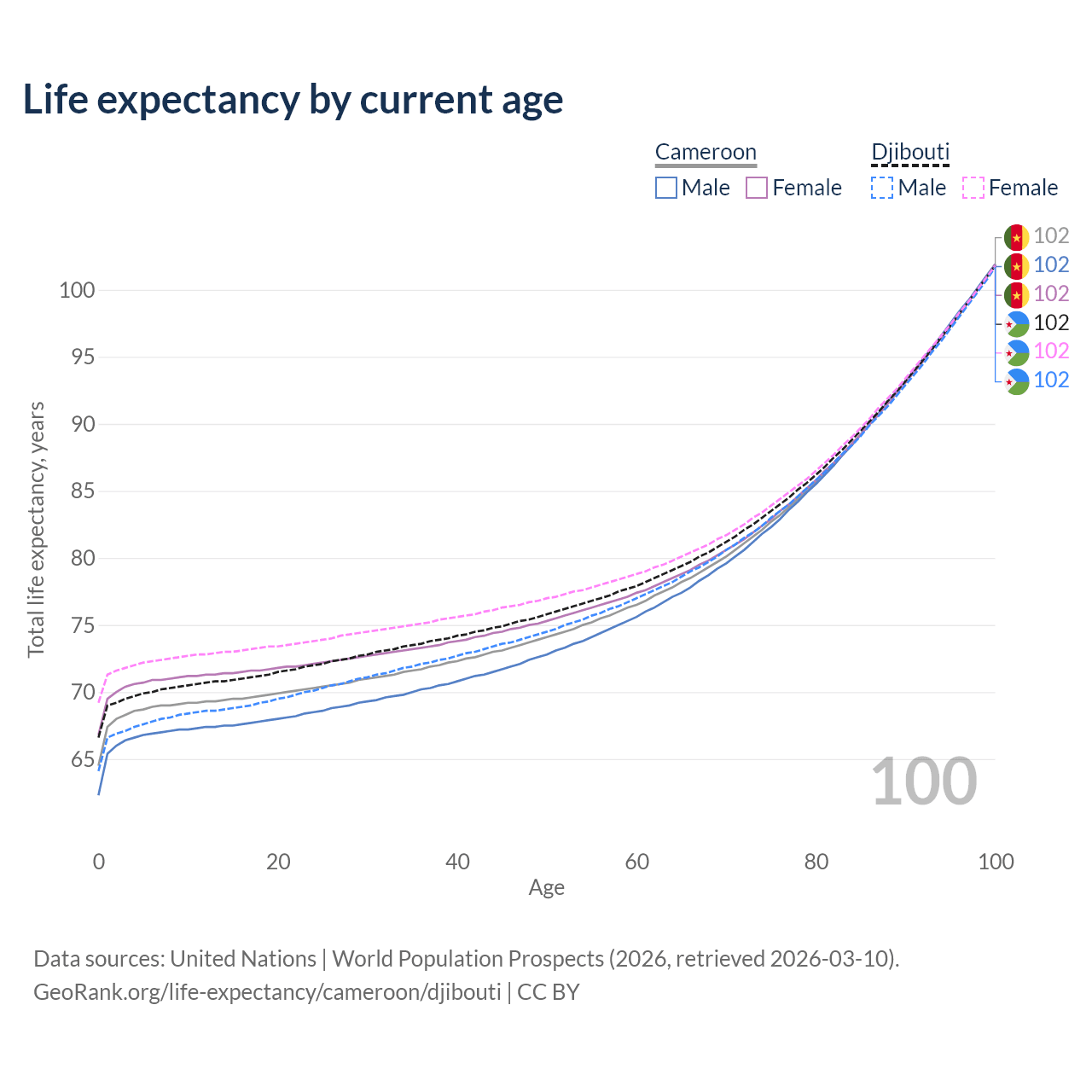 This life expectancy calculator shows the odds of living to 100, 95, 90, and below based on current age for both males and females in Cameroon and Djibouti, along with mean and median age of death. The calculations are based on the 2026 life tables (actuarial tables) from the UN World Population Prospects.