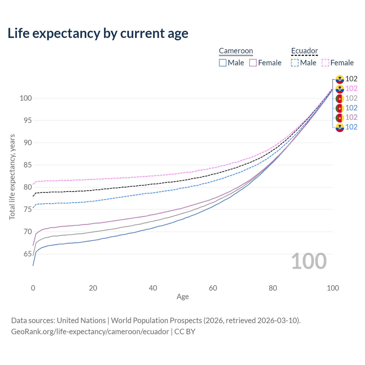 This life expectancy calculator shows the odds of living to 100, 95, 90, and below based on current age for both males and females in Cameroon and Ecuador, along with mean and median age of death. The calculations are based on the 2026 life tables (actuarial tables) from the UN World Population Prospects.