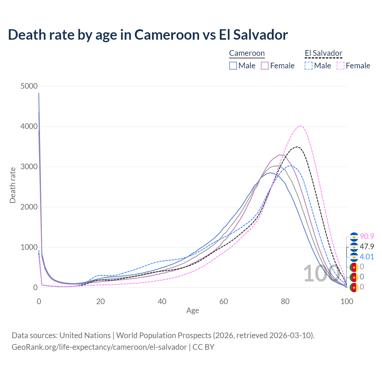 In Cameroon, the most common age of death is 0, compared to 84 in El Salvador. The median age of death is 71.6 in Cameroon and 78.1 in El Salvador, meaning only half of each cohort is expected to live past that age.