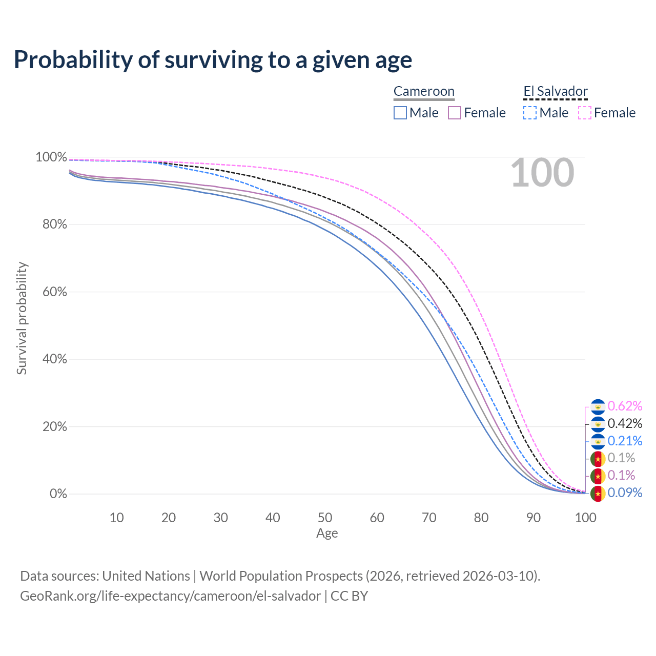 This life expectancy calculator shows the odds of living to 100, 95, 90, and below based on current age for both males and females in Cameroon and El Salvador, along with mean and median age of death. The calculations are based on the 2026 life tables (actuarial tables) from the UN World Population Prospects.