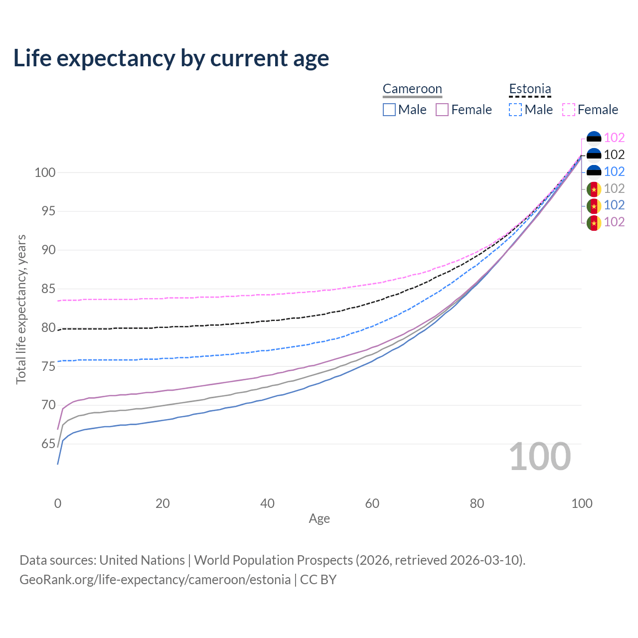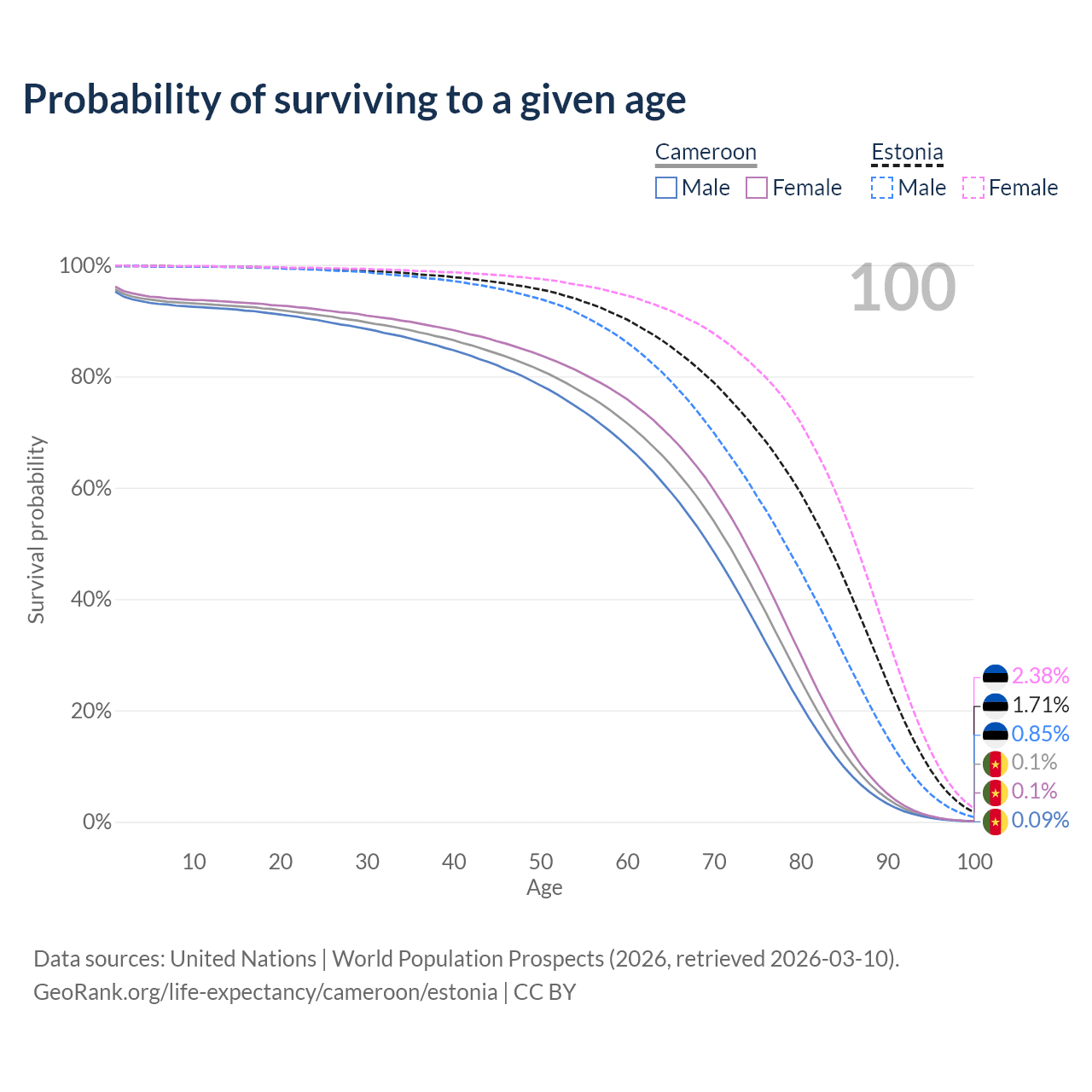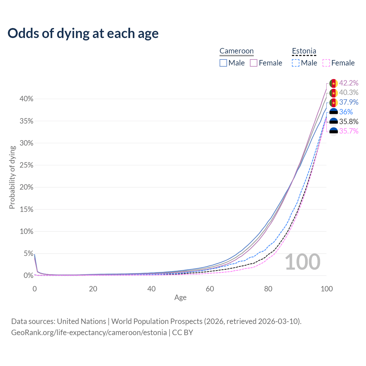This life expectancy calculator shows the odds of living to 100, 95, 90, and below based on current age for both males and females in Cameroon and Estonia, along with mean and median age of death. The calculations are based on the 2026 life tables (actuarial tables) from the UN World Population Prospects.