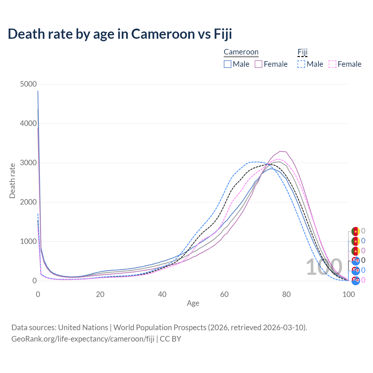 In Cameroon, the most common age of death is 0, compared to 74 in Fiji. The median age of death is 71.6 in Cameroon and 70.5 in Fiji, meaning only half of each cohort is expected to live past that age.