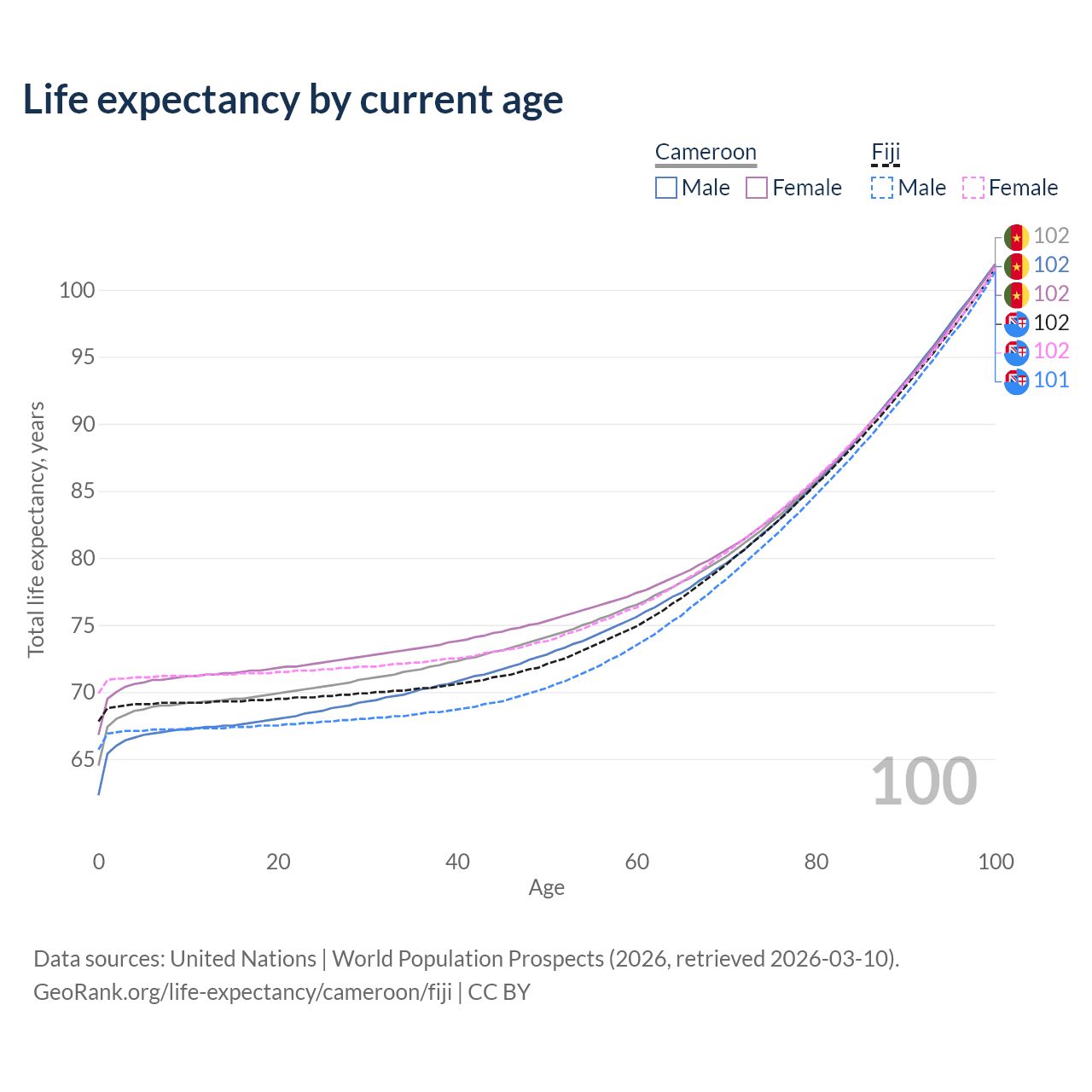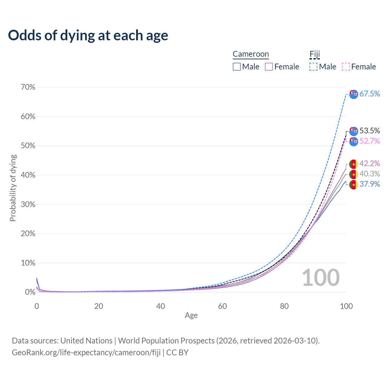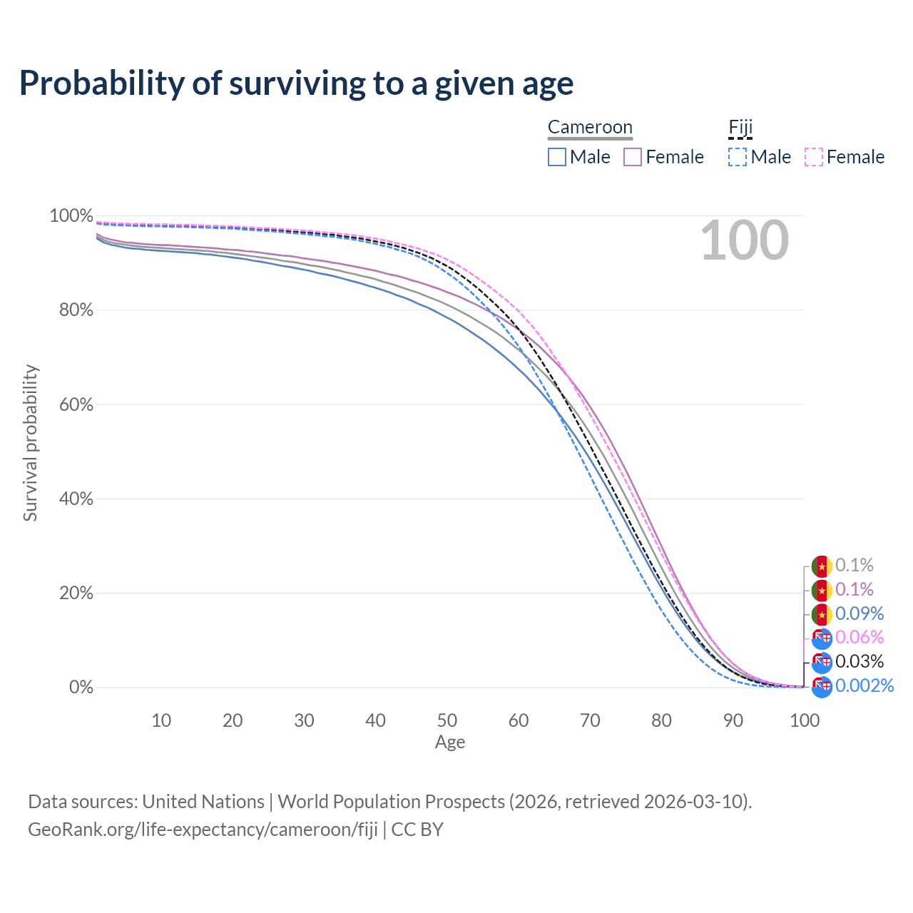 This life expectancy calculator shows the odds of living to 100, 95, 90, and below based on current age for both males and females in Cameroon and Fiji, along with mean and median age of death. The calculations are based on the 2026 life tables (actuarial tables) from the UN World Population Prospects.