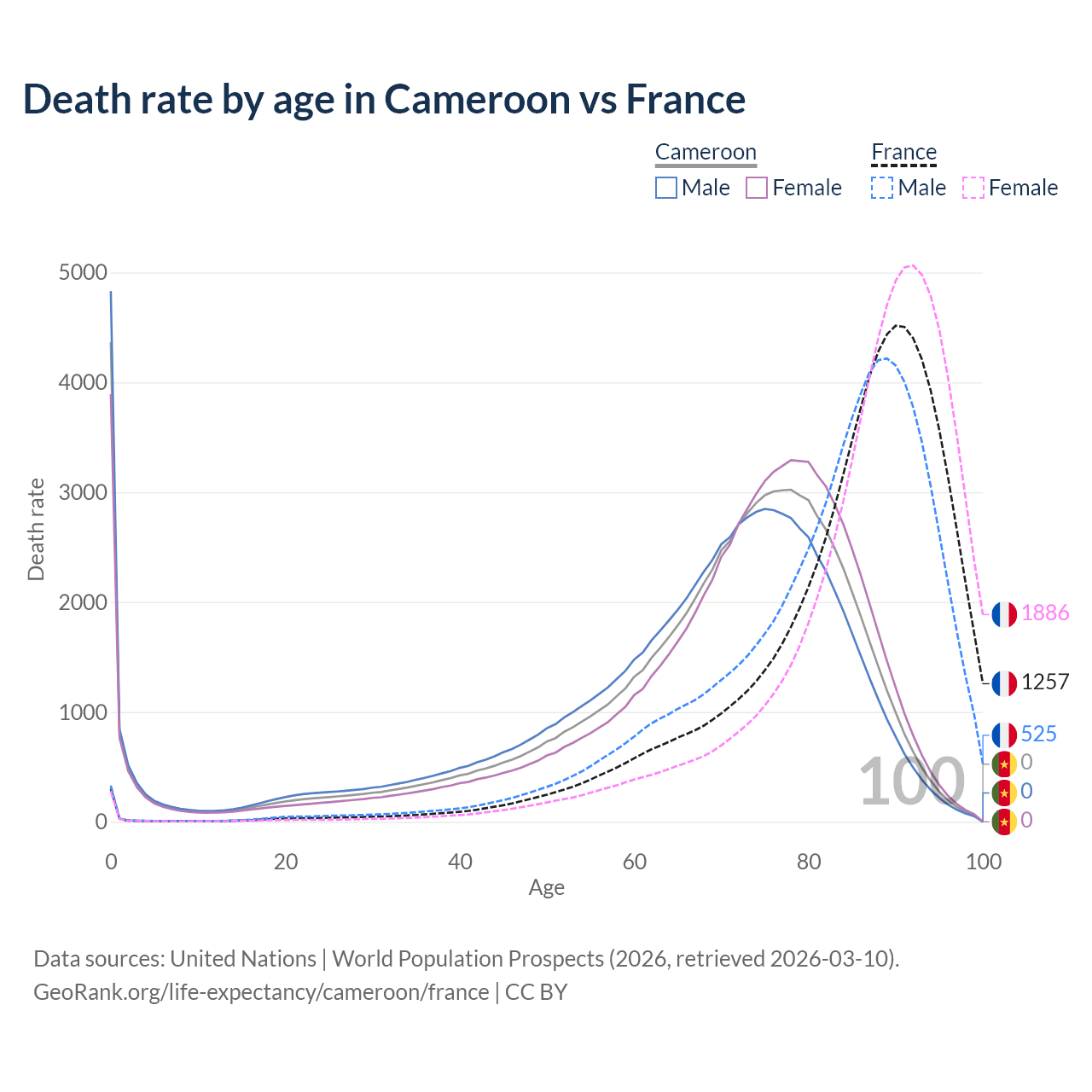 In Cameroon, the most common age of death is 0, compared to 90 in France. The median age of death is 71.6 in Cameroon and 87.4 in France, meaning only half of each cohort is expected to live past that age.