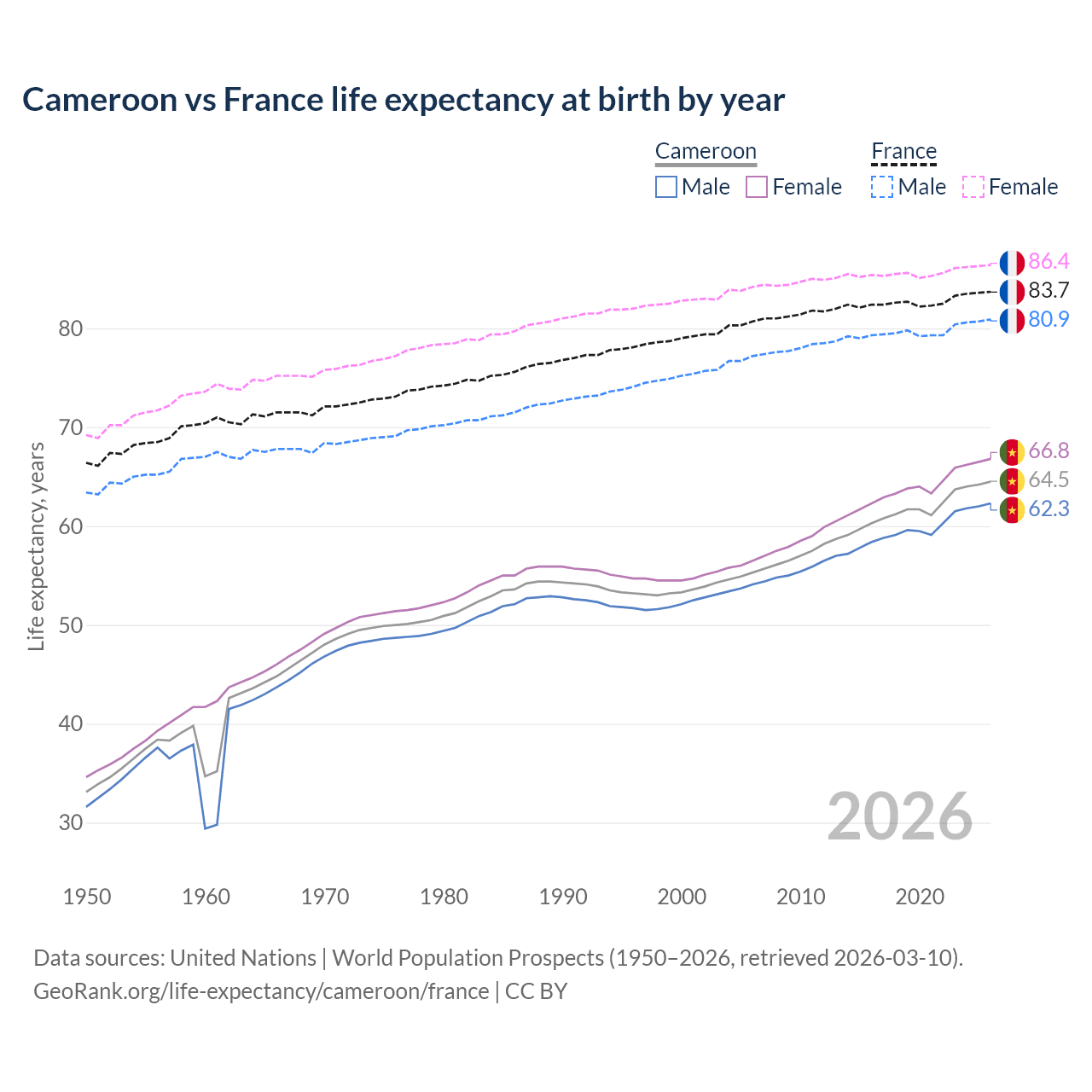 The average life expectancy at birth is 64.5 years in Cameroon vs 83.7 in France. Cameroon is ranked 174/197 by life expectancy, and France is 15/197. In Cameroon, the life expectancy is 62.3 years for males and 66.8 years for females. In France, it's 80.9 years for males and 86.4 years for females.