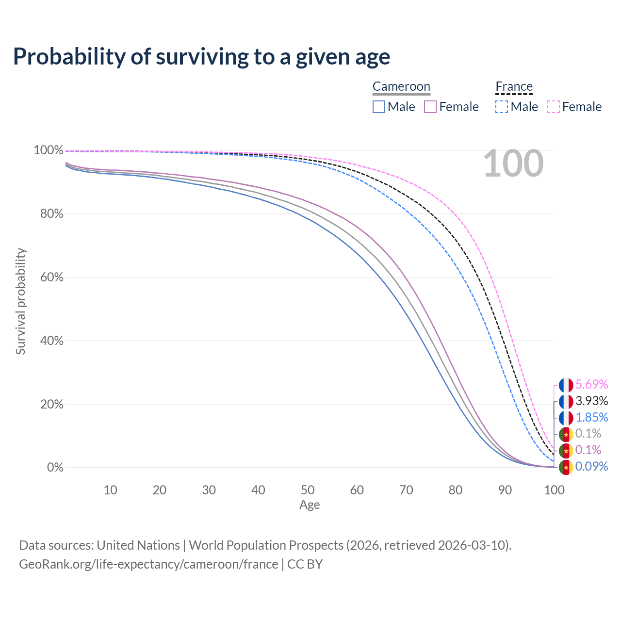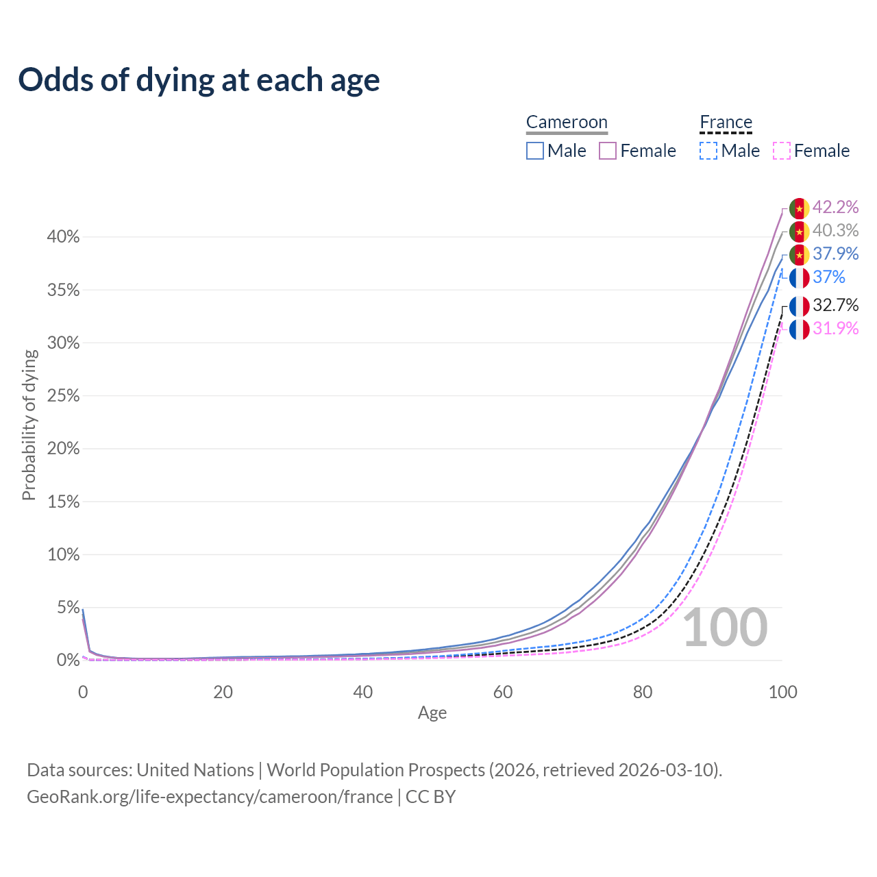 This life expectancy calculator shows the odds of living to 100, 95, 90, and below based on current age for both males and females in Cameroon and France, along with mean and median age of death. The calculations are based on the 2026 life tables (actuarial tables) from the UN World Population Prospects.