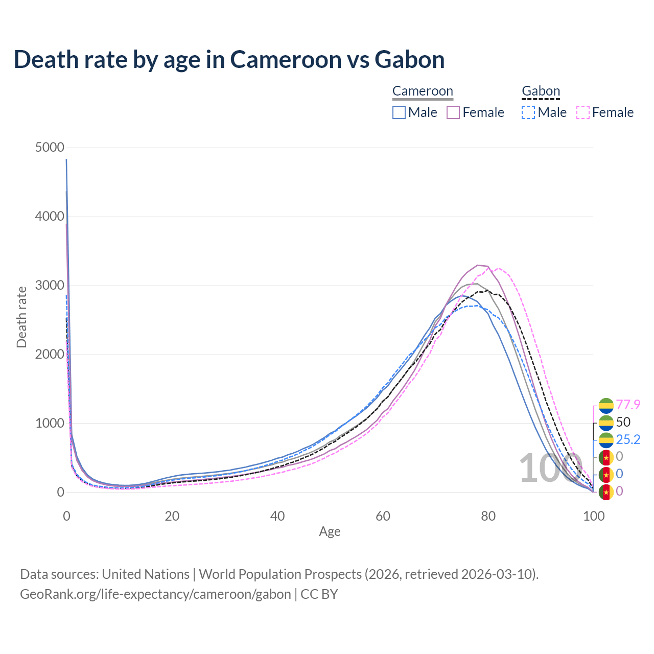 In Cameroon, the most common age of death is 0, compared to 80 in Gabon. The median age of death is 71.6 in Cameroon and 73.9 in Gabon, meaning only half of each cohort is expected to live past that age.