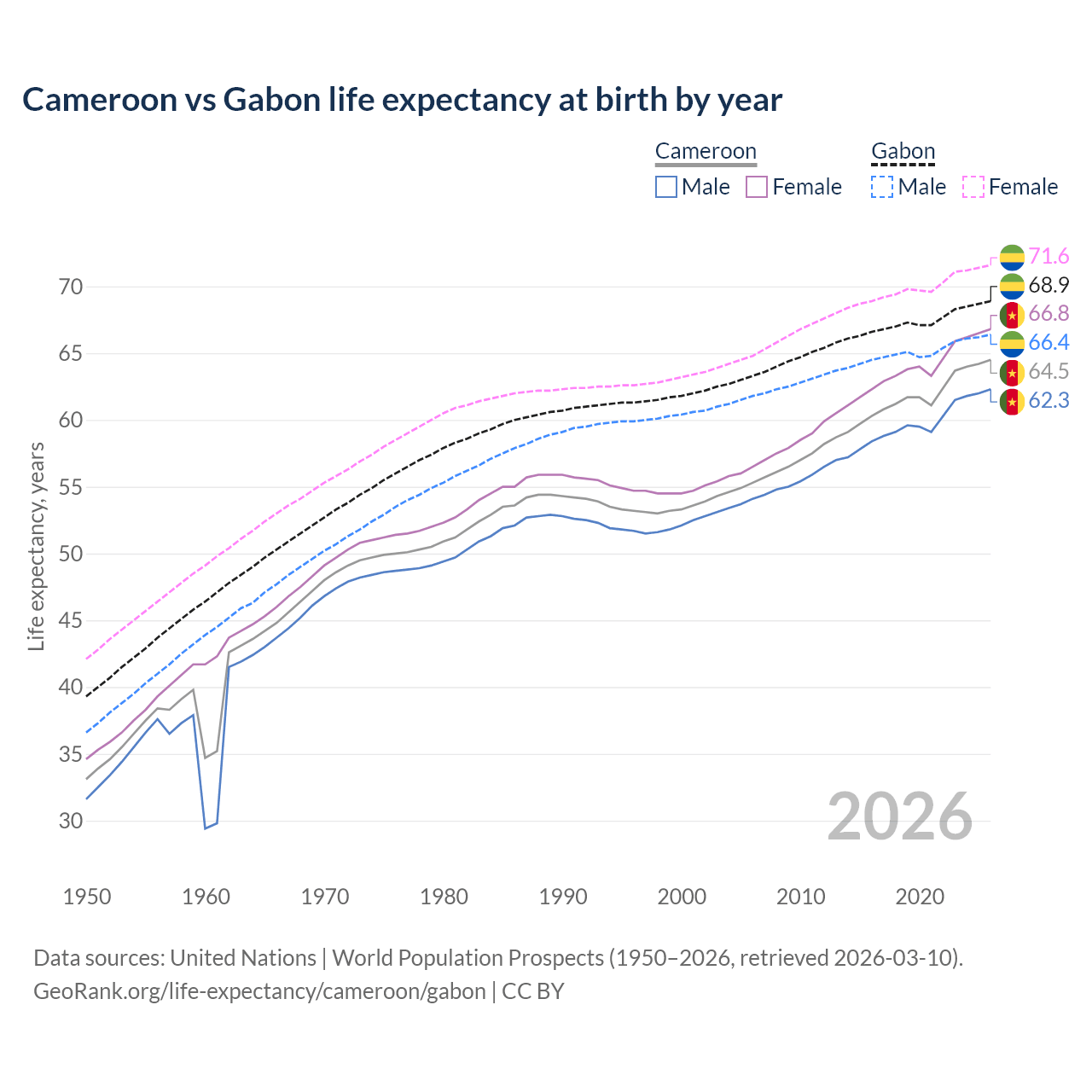 The average life expectancy at birth is 64.5 years in Cameroon vs 68.9 in Gabon. Cameroon is ranked 174/197 by life expectancy, and Gabon is 147/197. In Cameroon, the life expectancy is 62.3 years for males and 66.8 years for females. In Gabon, it's 66.4 years for males and 71.6 years for females.