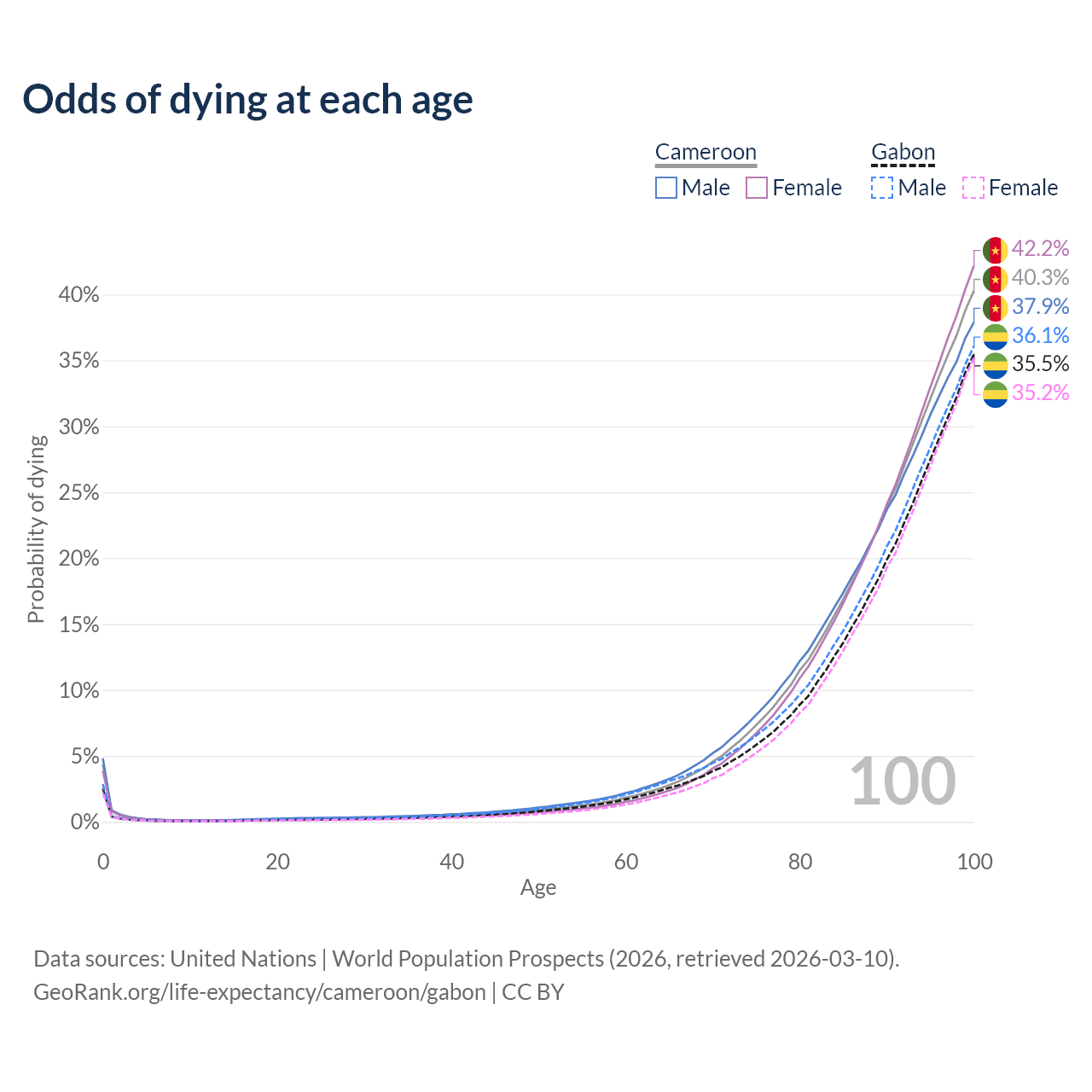 This life expectancy calculator shows the odds of living to 100, 95, 90, and below based on current age for both males and females in Cameroon and Gabon, along with mean and median age of death. The calculations are based on the 2026 life tables (actuarial tables) from the UN World Population Prospects.