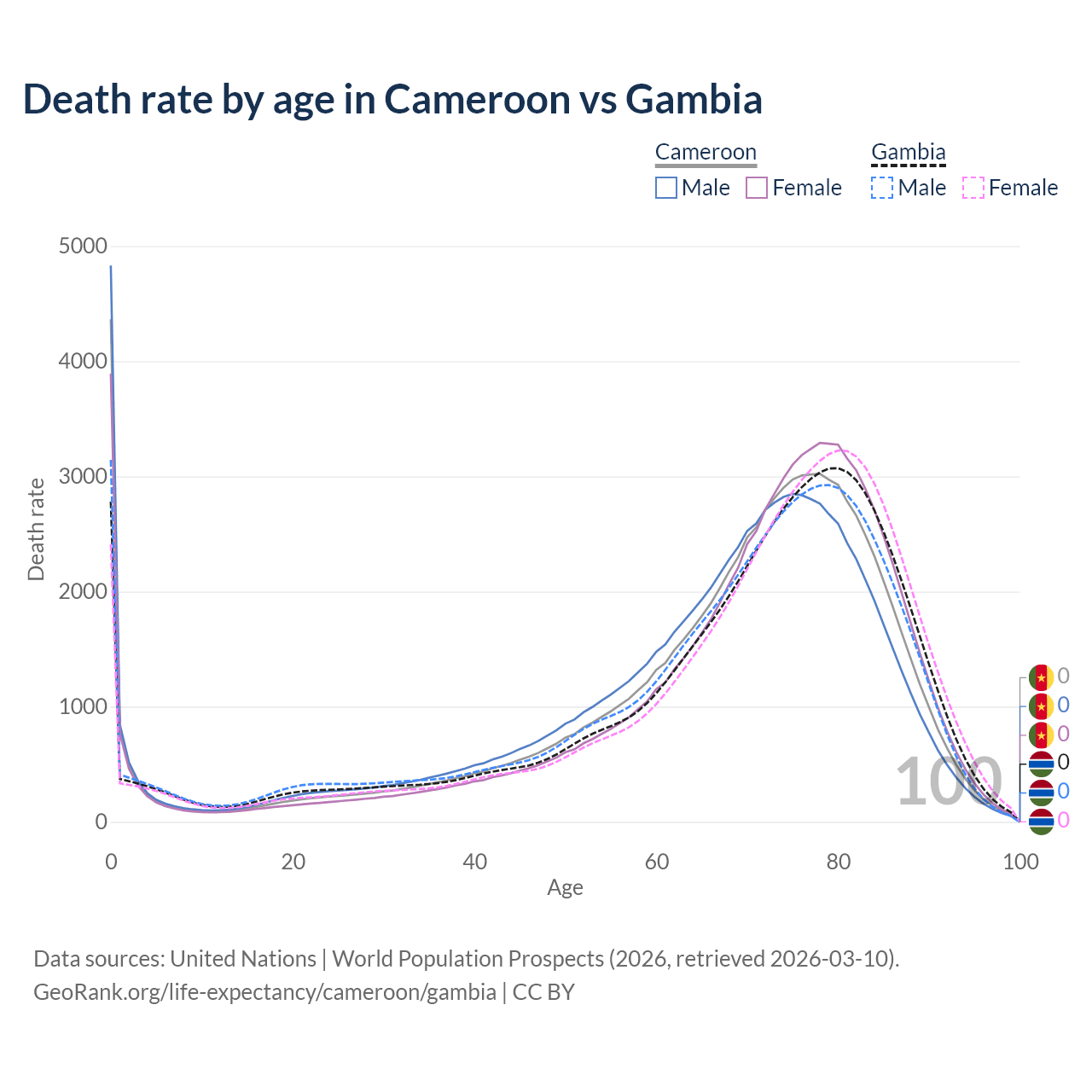This life expectancy calculator shows the odds of living to 100, 95, 90, and below based on current age for both males and females in Cameroon and the Gambia, along with mean and median age of death. The calculations are based on the 2026 life tables (actuarial tables) from the UN World Population Prospects.