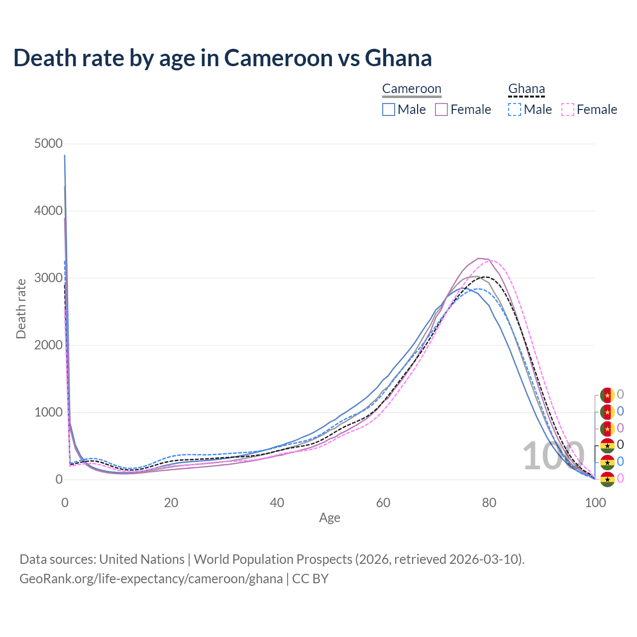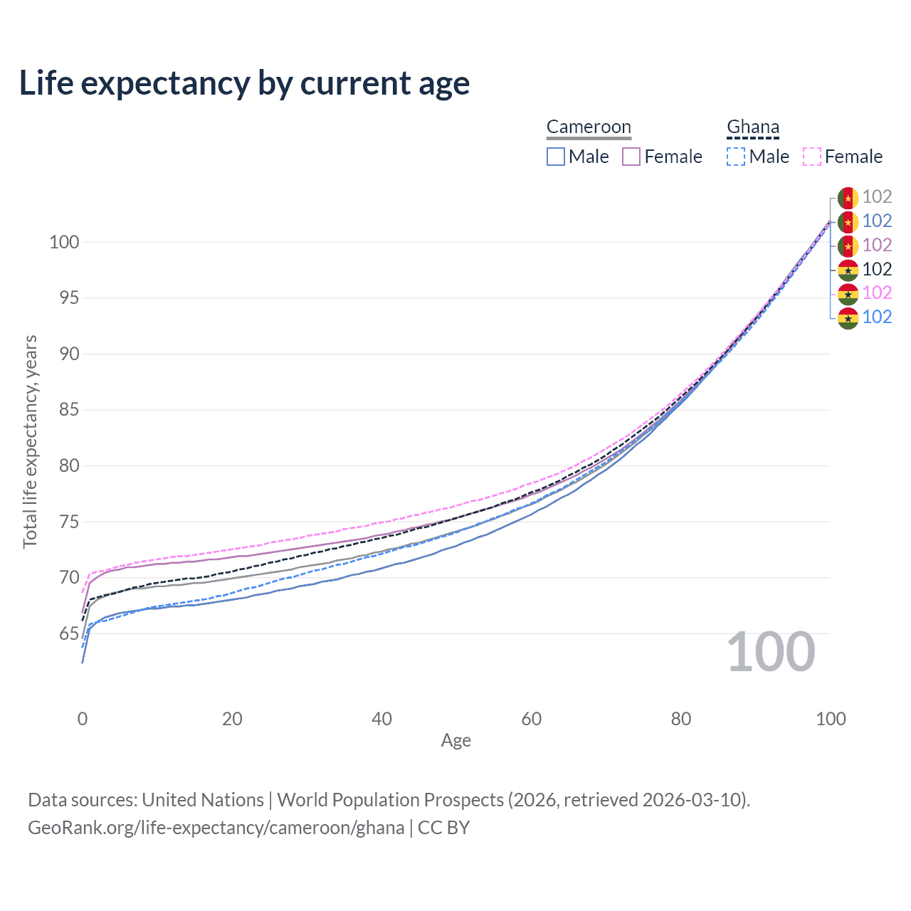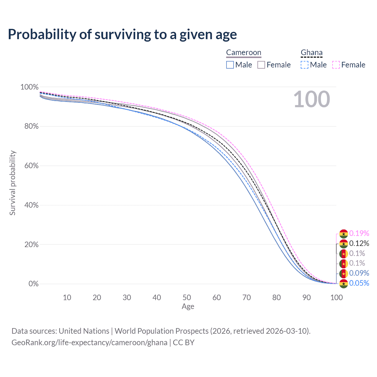 This life expectancy calculator shows the odds of living to 100, 95, 90, and below based on current age for both males and females in Cameroon and Ghana, along with mean and median age of death. The calculations are based on the 2026 life tables (actuarial tables) from the UN World Population Prospects.