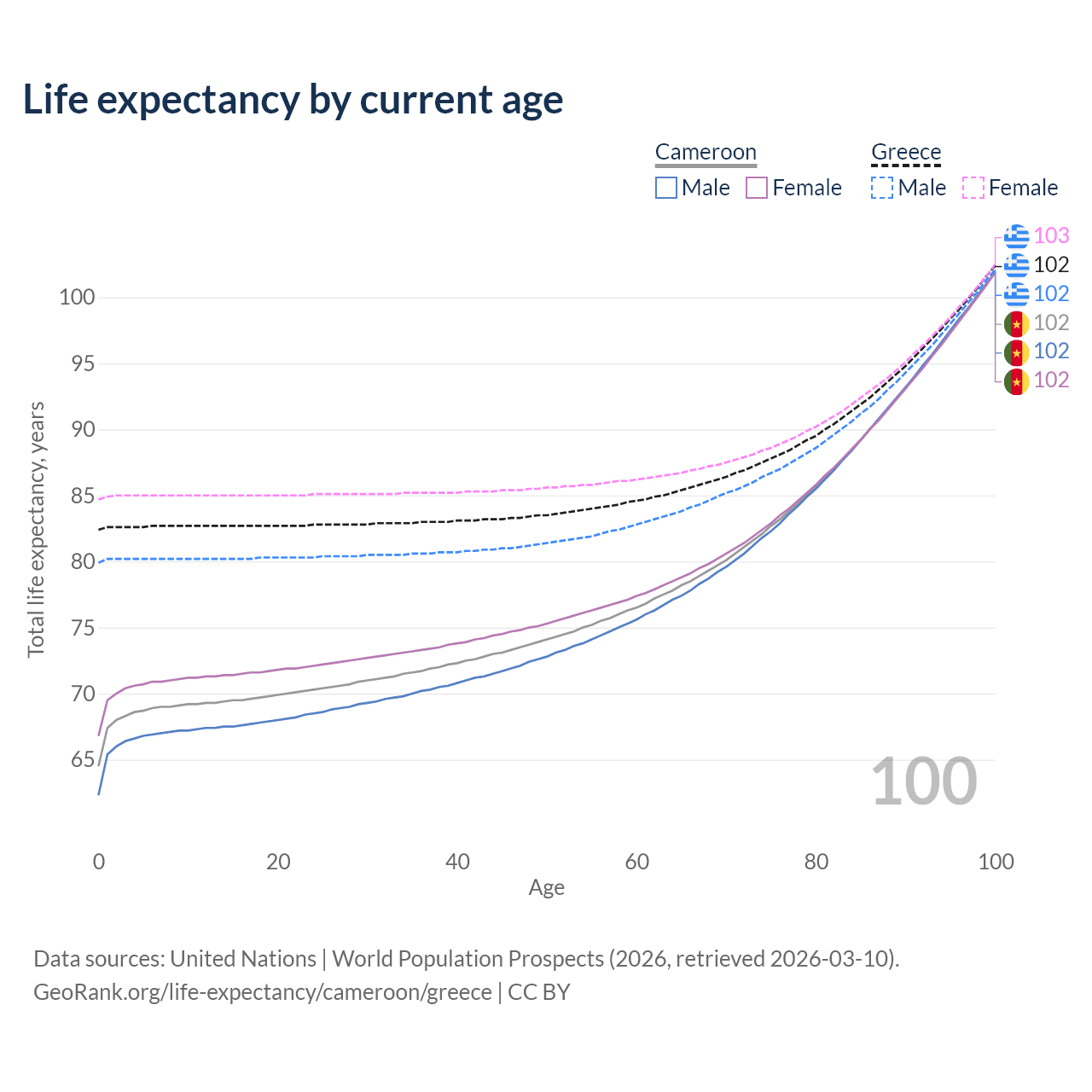 This life expectancy calculator shows the odds of living to 100, 95, 90, and below based on current age for both males and females in Cameroon and Greece, along with mean and median age of death. The calculations are based on the 2026 life tables (actuarial tables) from the UN World Population Prospects.
