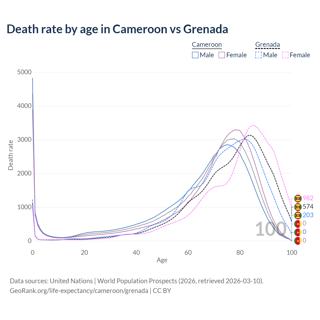 In Cameroon, the most common age of death is 0, compared to 84 in Grenada. The median age of death is 71.6 in Cameroon and 79.3 in Grenada, meaning only half of each cohort is expected to live past that age.