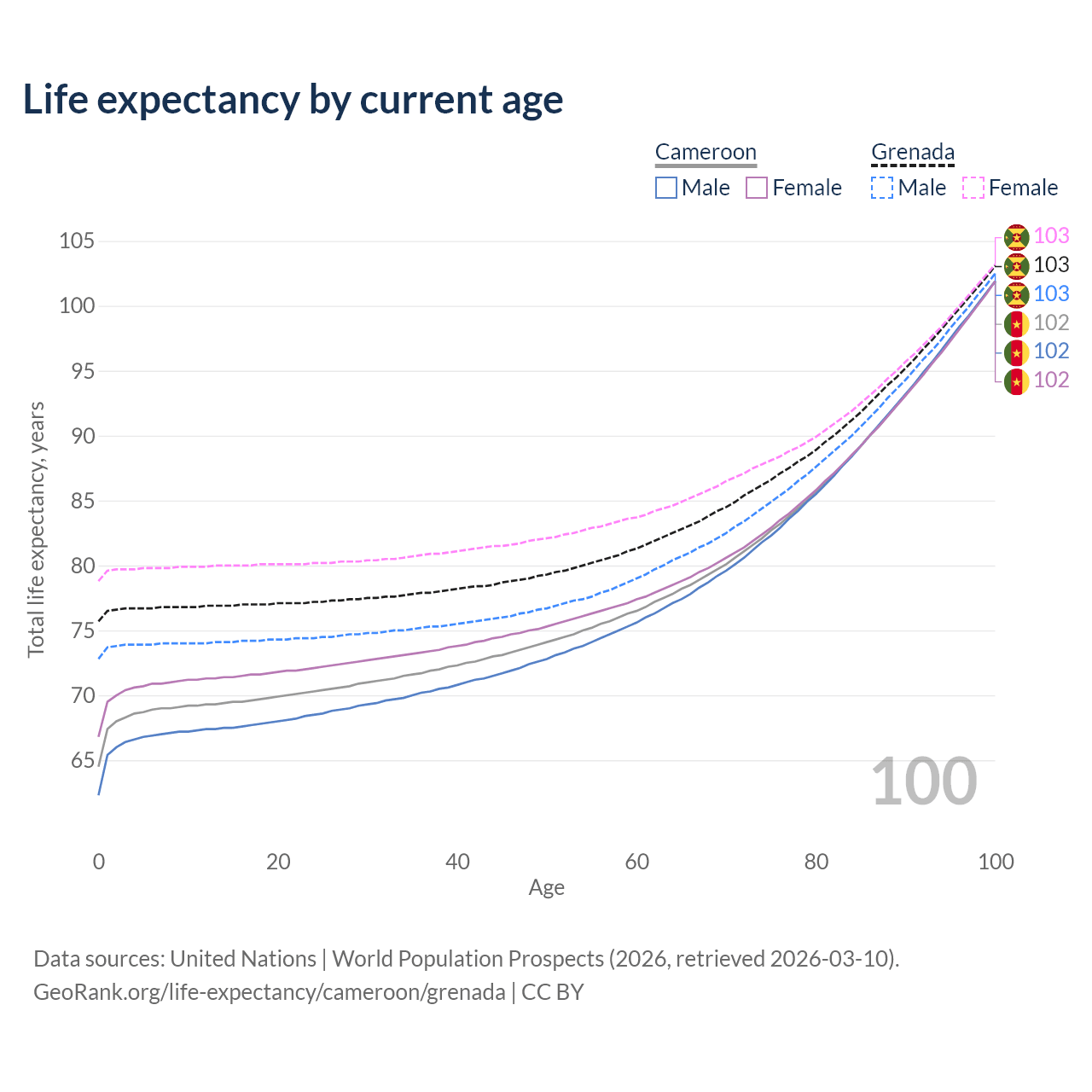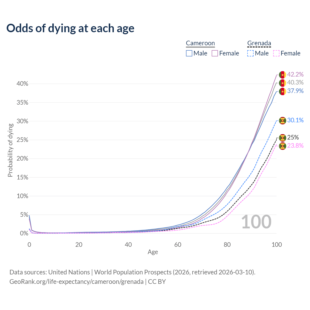This life expectancy calculator shows the odds of living to 100, 95, 90, and below based on current age for both males and females in Cameroon and Grenada, along with mean and median age of death. The calculations are based on the 2026 life tables (actuarial tables) from the UN World Population Prospects.