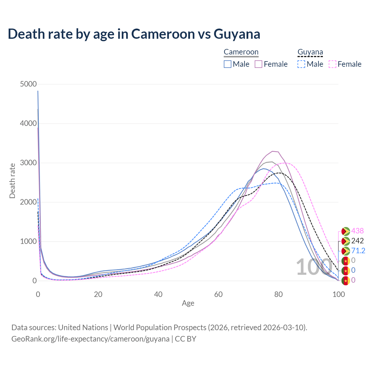 In Cameroon, the most common age of death is 0, compared to 80 in Guyana. The median age of death is 71.6 in Cameroon and 74.1 in Guyana, meaning only half of each cohort is expected to live past that age.