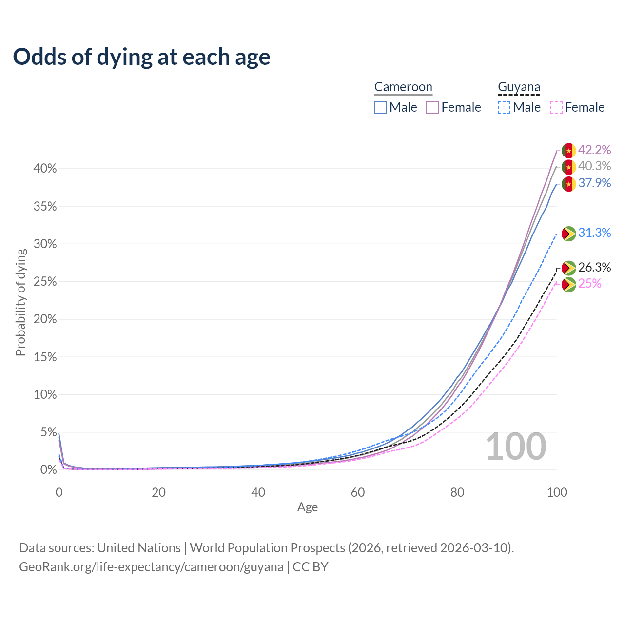 This life expectancy calculator shows the odds of living to 100, 95, 90, and below based on current age for both males and females in Cameroon and Guyana, along with mean and median age of death. The calculations are based on the 2026 life tables (actuarial tables) from the UN World Population Prospects.