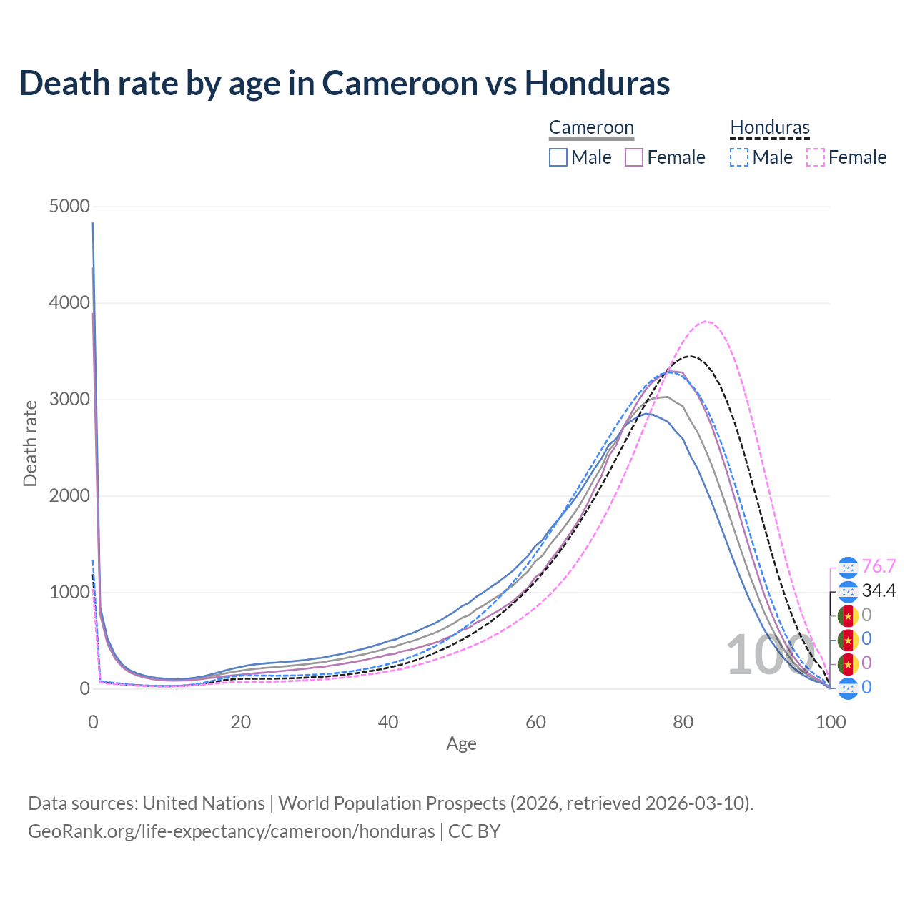 In Cameroon, the most common age of death is 0, compared to 81 in Honduras. The median age of death is 71.6 in Cameroon and 77.1 in Honduras, meaning only half of each cohort is expected to live past that age.