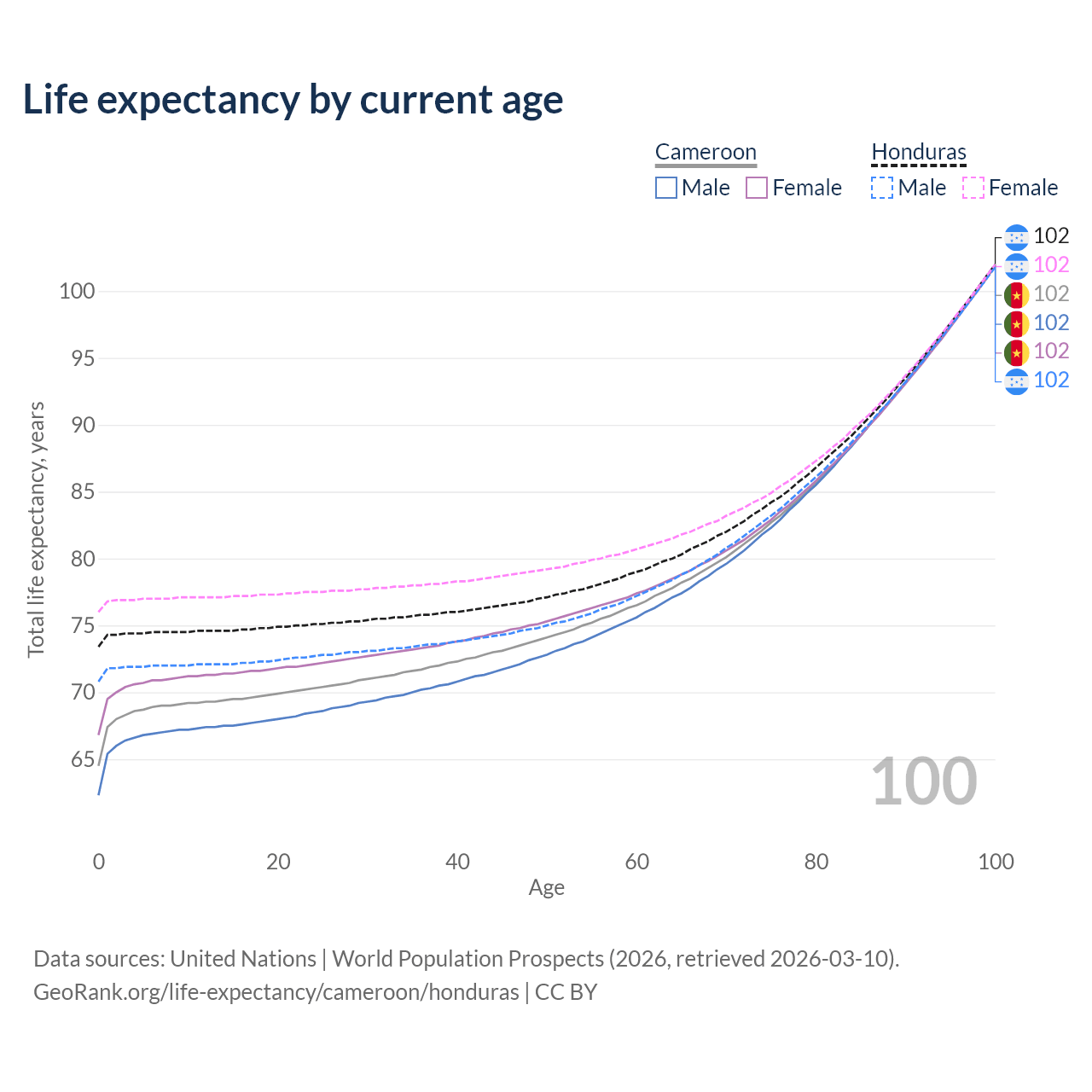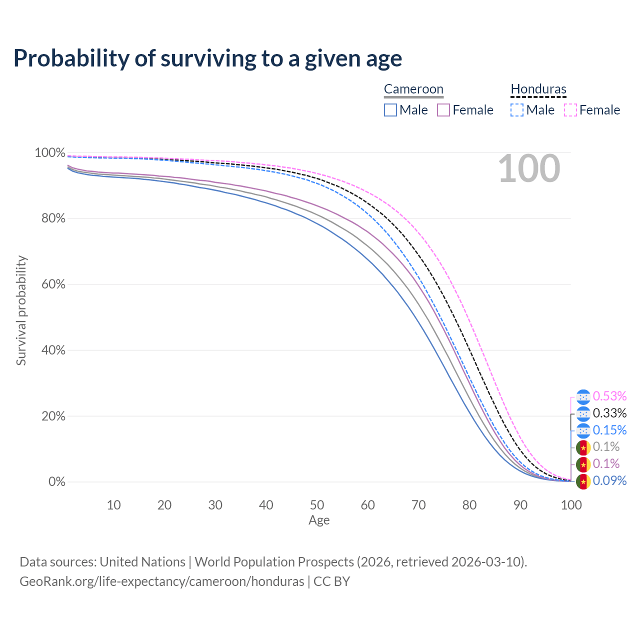This life expectancy calculator shows the odds of living to 100, 95, 90, and below based on current age for both males and females in Cameroon and Honduras, along with mean and median age of death. The calculations are based on the 2026 life tables (actuarial tables) from the UN World Population Prospects.