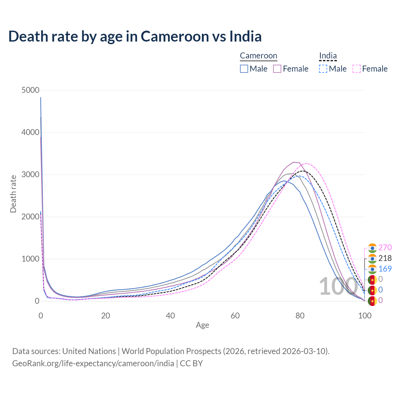 In Cameroon, the most common age of death is 0, compared to 81 in India. The median age of death is 71.6 in Cameroon and 76.8 in India, meaning only half of each cohort is expected to live past that age.