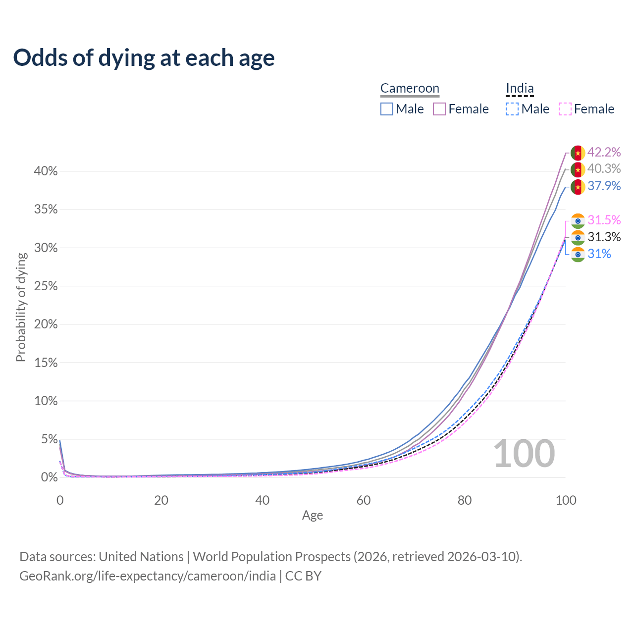 This life expectancy calculator shows the odds of living to 100, 95, 90, and below based on current age for both males and females in Cameroon and India, along with mean and median age of death. The calculations are based on the 2026 life tables (actuarial tables) from the UN World Population Prospects.