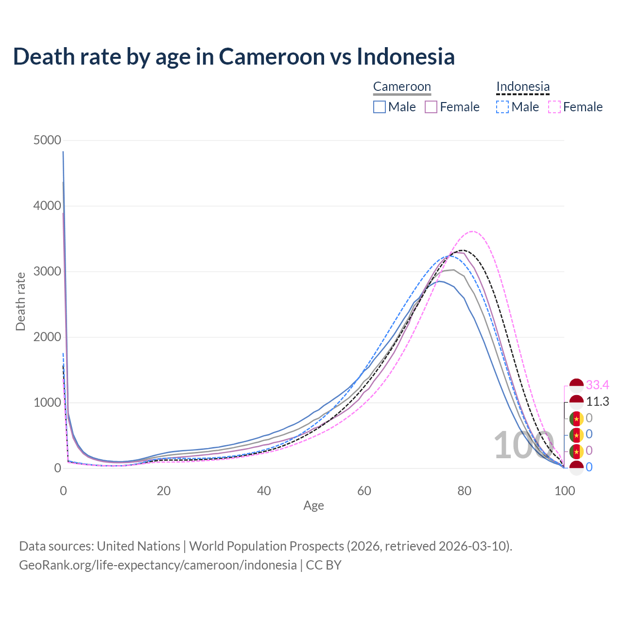 This life expectancy calculator shows the odds of living to 100, 95, 90, and below based on current age for both males and females in Cameroon and Indonesia, along with mean and median age of death. The calculations are based on the 2026 life tables (actuarial tables) from the UN World Population Prospects.