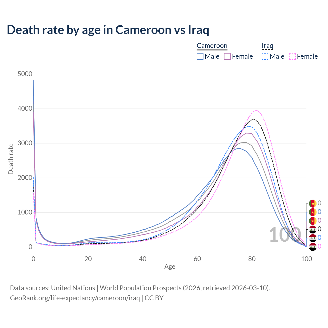In Cameroon, the most common age of death is 0, compared to 81 in Iraq. The median age of death is 71.6 in Cameroon and 76.7 in Iraq, meaning only half of each cohort is expected to live past that age.