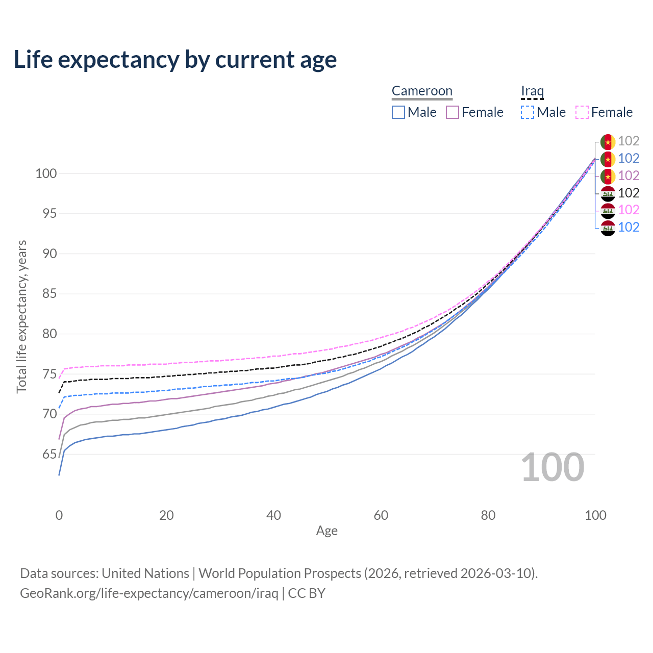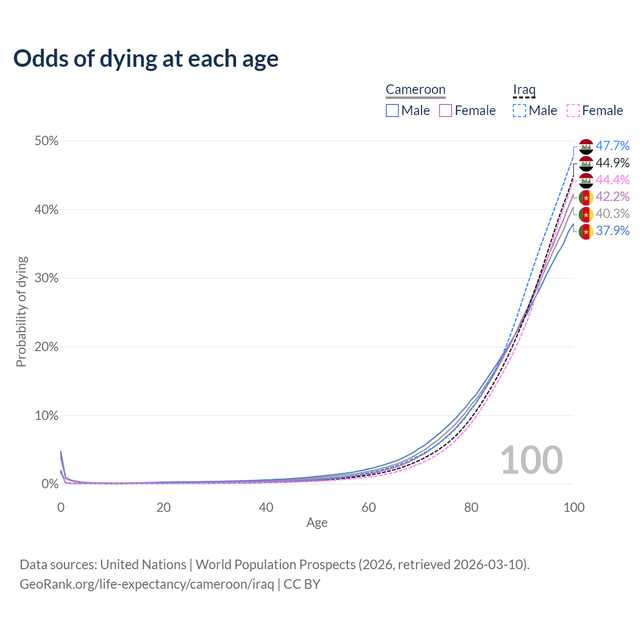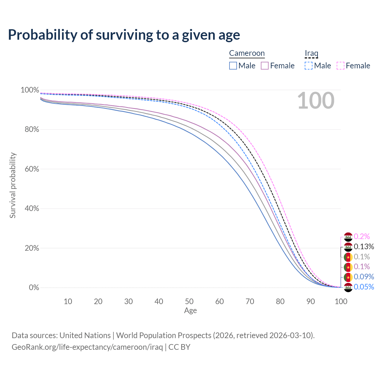 This life expectancy calculator shows the odds of living to 100, 95, 90, and below based on current age for both males and females in Cameroon and Iraq, along with mean and median age of death. The calculations are based on the 2026 life tables (actuarial tables) from the UN World Population Prospects.