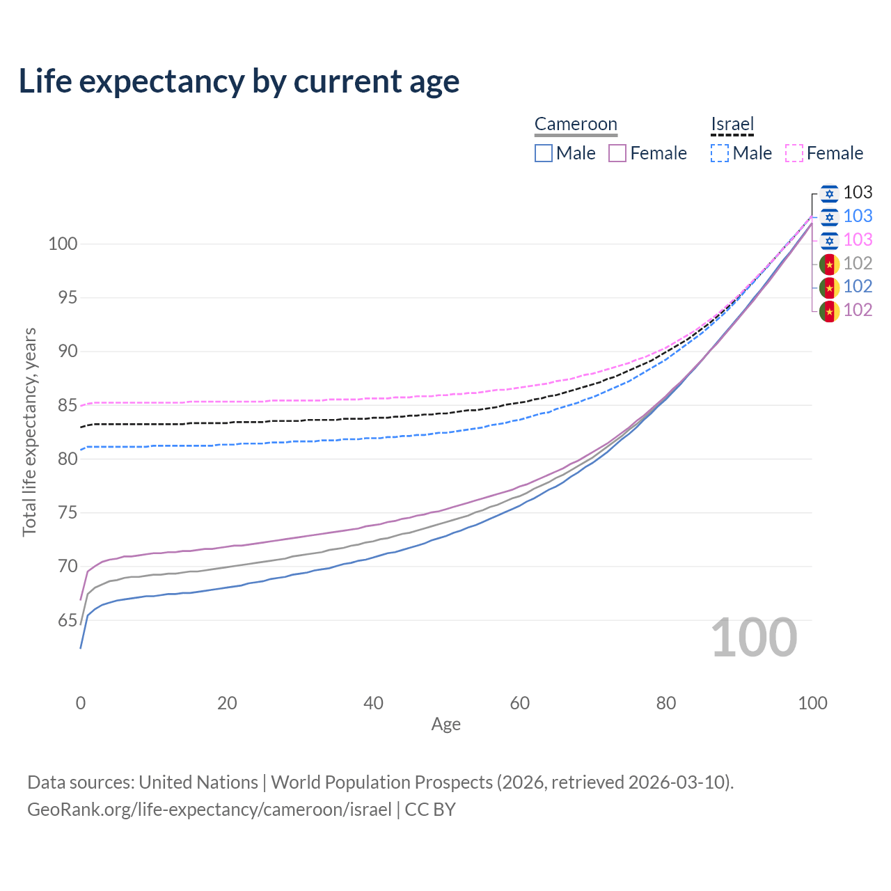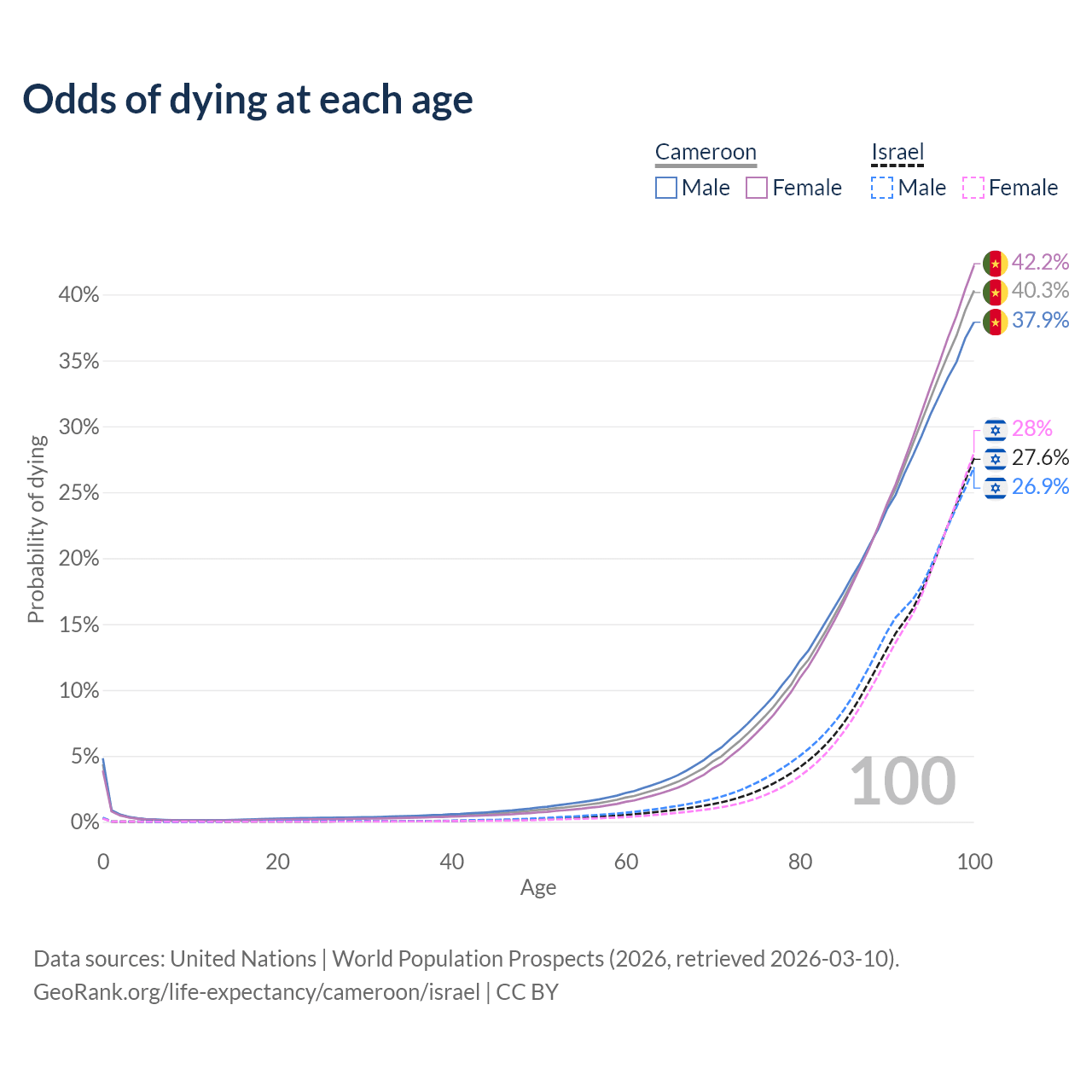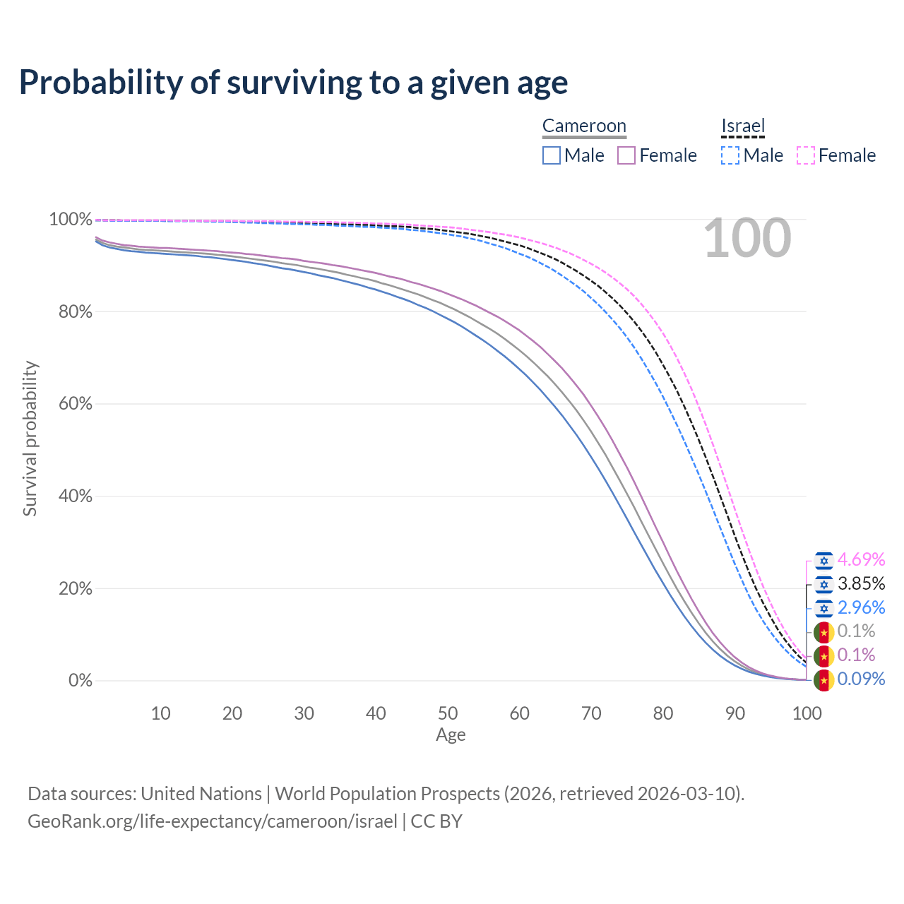 This life expectancy calculator shows the odds of living to 100, 95, 90, and below based on current age for both males and females in Cameroon and Israel, along with mean and median age of death. The calculations are based on the 2026 life tables (actuarial tables) from the UN World Population Prospects.
