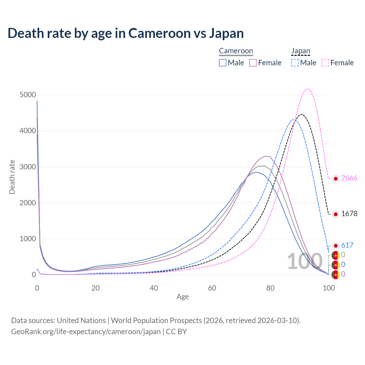 In Cameroon, the most common age of death is 0, compared to 91 in Japan. The median age of death is 71.6 in Cameroon and 88.1 in Japan, meaning only half of each cohort is expected to live past that age.
