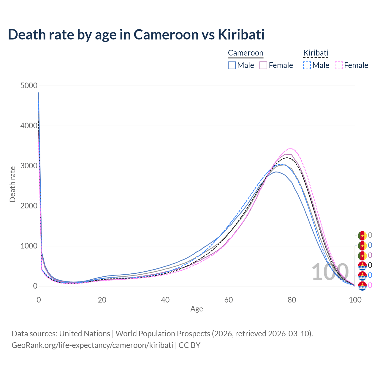 This life expectancy calculator shows the odds of living to 100, 95, 90, and below based on current age for both males and females in Cameroon and Kiribati, along with mean and median age of death. The calculations are based on the 2026 life tables (actuarial tables) from the UN World Population Prospects.