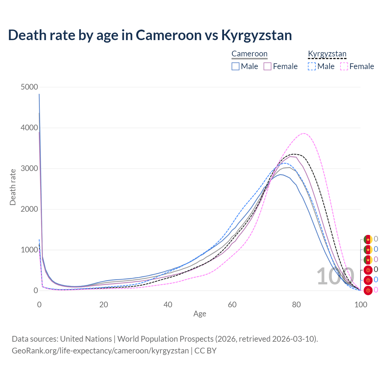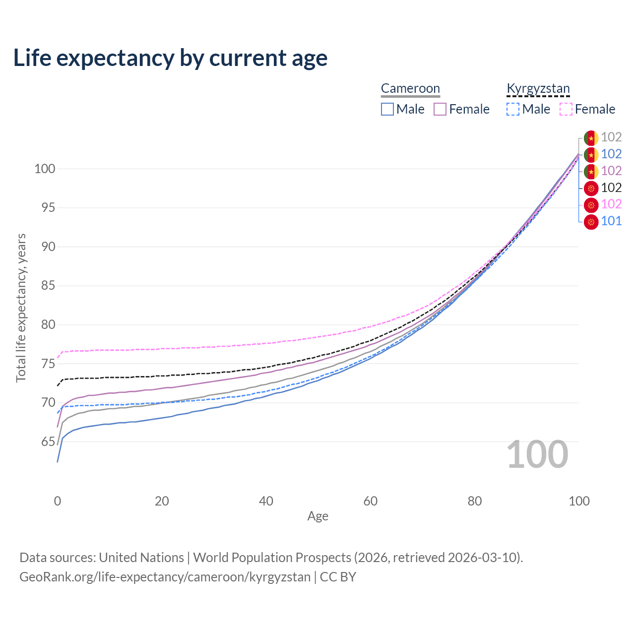 This life expectancy calculator shows the odds of living to 100, 95, 90, and below based on current age for both males and females in Cameroon and Kyrgyzstan, along with mean and median age of death. The calculations are based on the 2026 life tables (actuarial tables) from the UN World Population Prospects.