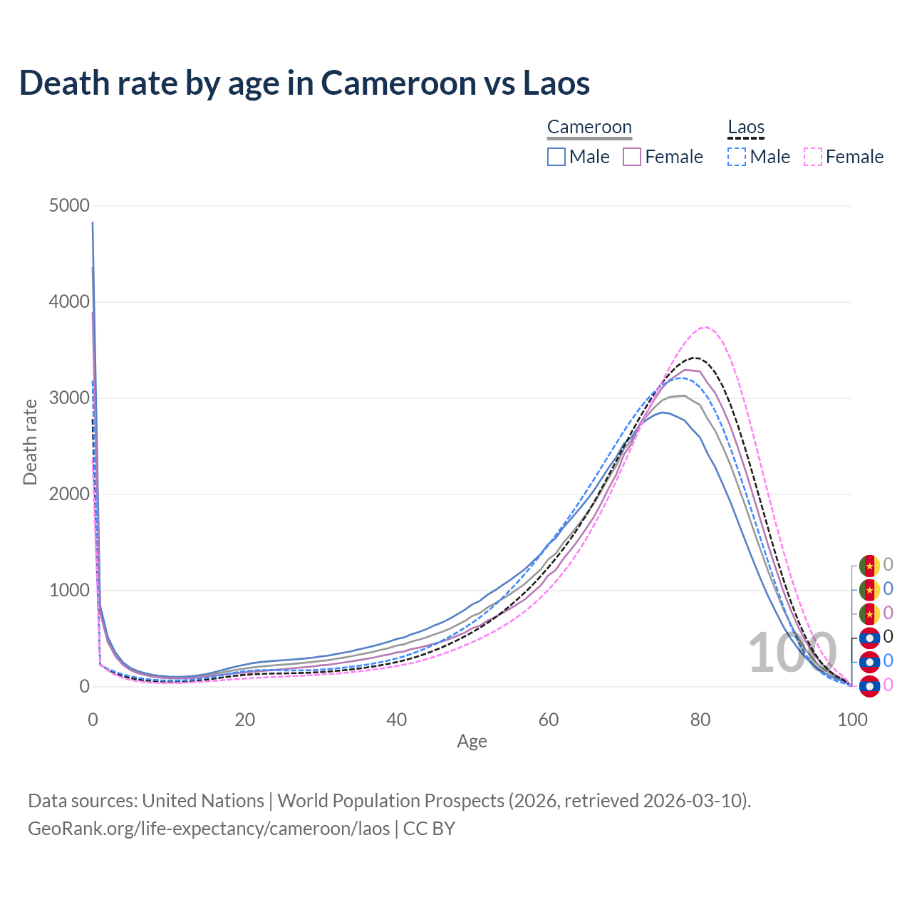In Cameroon, the most common age of death is 0, compared to 79 in Laos. The median age of death is 71.6 in Cameroon and 74.7 in Laos, meaning only half of each cohort is expected to live past that age.