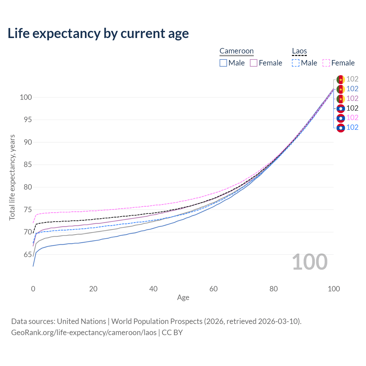 This life expectancy calculator shows the odds of living to 100, 95, 90, and below based on current age for both males and females in Cameroon and Laos, along with mean and median age of death. The calculations are based on the 2026 life tables (actuarial tables) from the UN World Population Prospects.