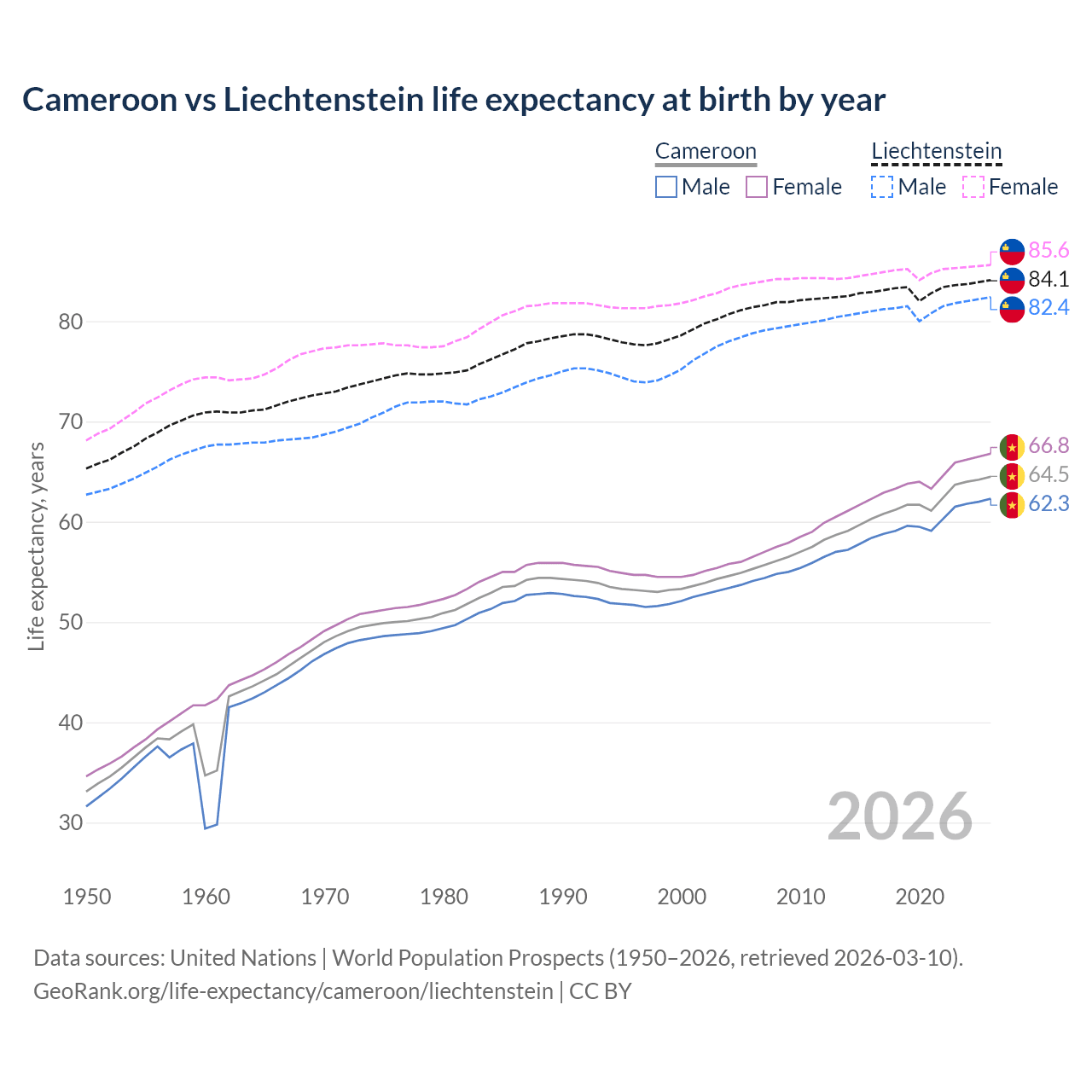 The average life expectancy at birth is 64.5 years in Cameroon vs 84.1 in Liechtenstein. Cameroon is ranked 174/197 by life expectancy, and Liechtenstein is 11/197. In Cameroon, the life expectancy is 62.3 years for males and 66.8 years for females. In Liechtenstein, it's 82.4 years for males and 85.6 years for females.