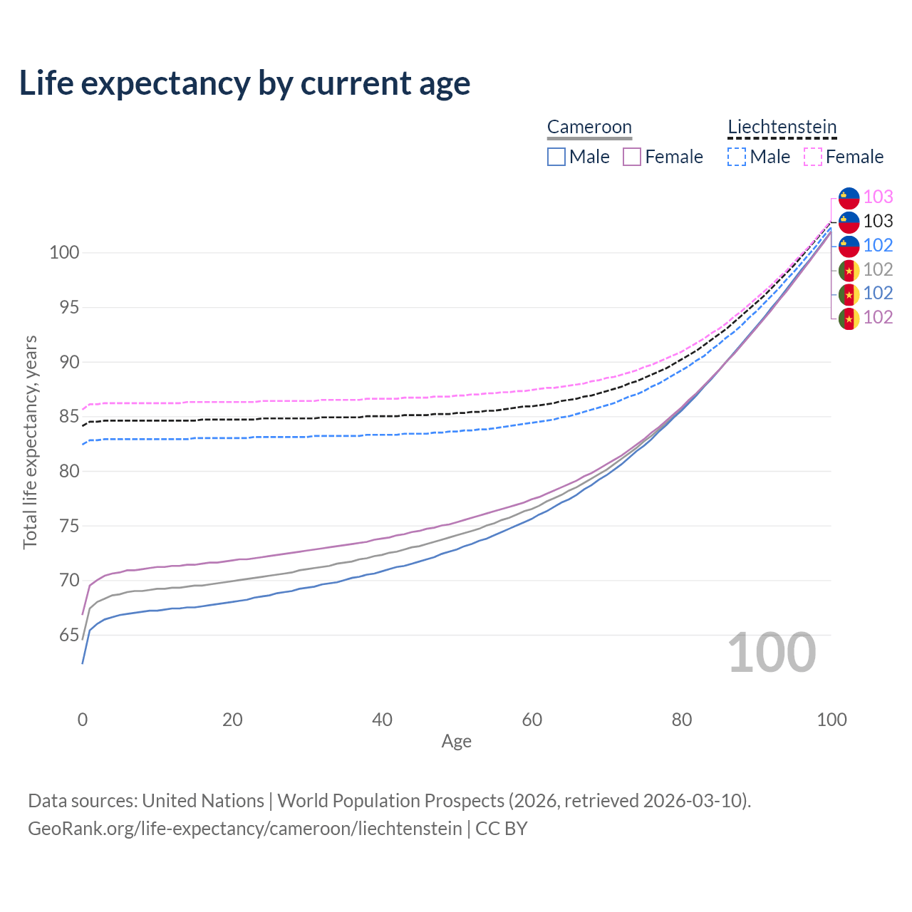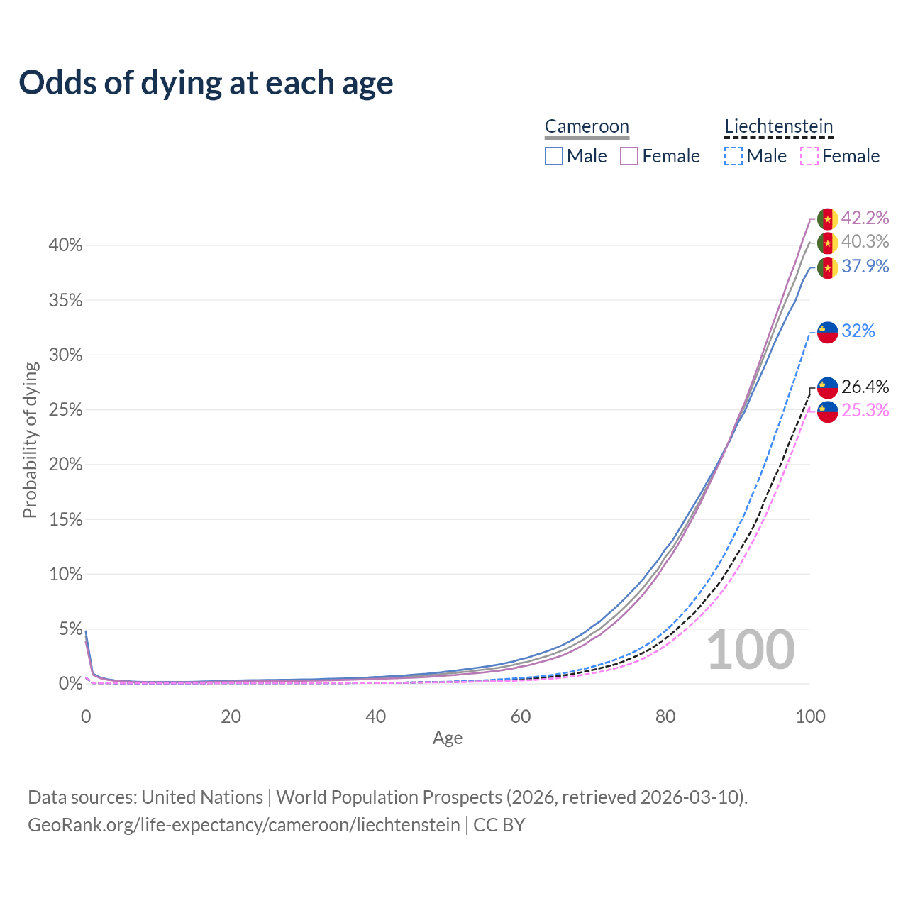 This life expectancy calculator shows the odds of living to 100, 95, 90, and below based on current age for both males and females in Cameroon and Liechtenstein, along with mean and median age of death. The calculations are based on the 2026 life tables (actuarial tables) from the UN World Population Prospects.