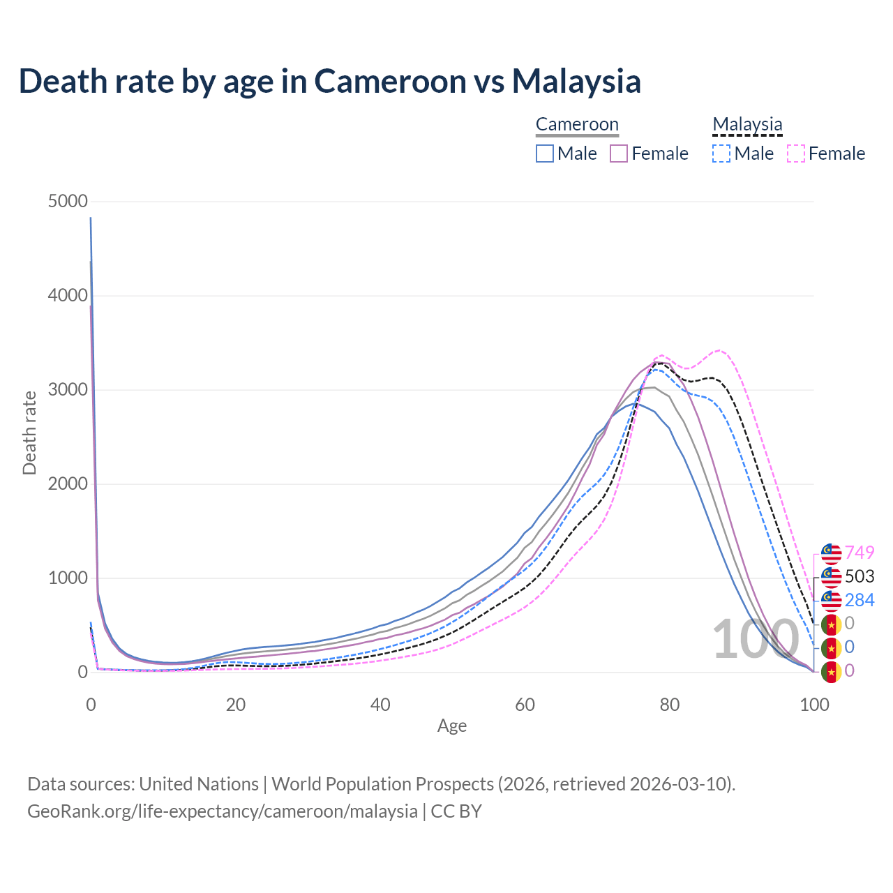 In Cameroon, the most common age of death is 0, compared to 79 in Malaysia. The median age of death is 71.6 in Cameroon and 79.8 in Malaysia, meaning only half of each cohort is expected to live past that age.