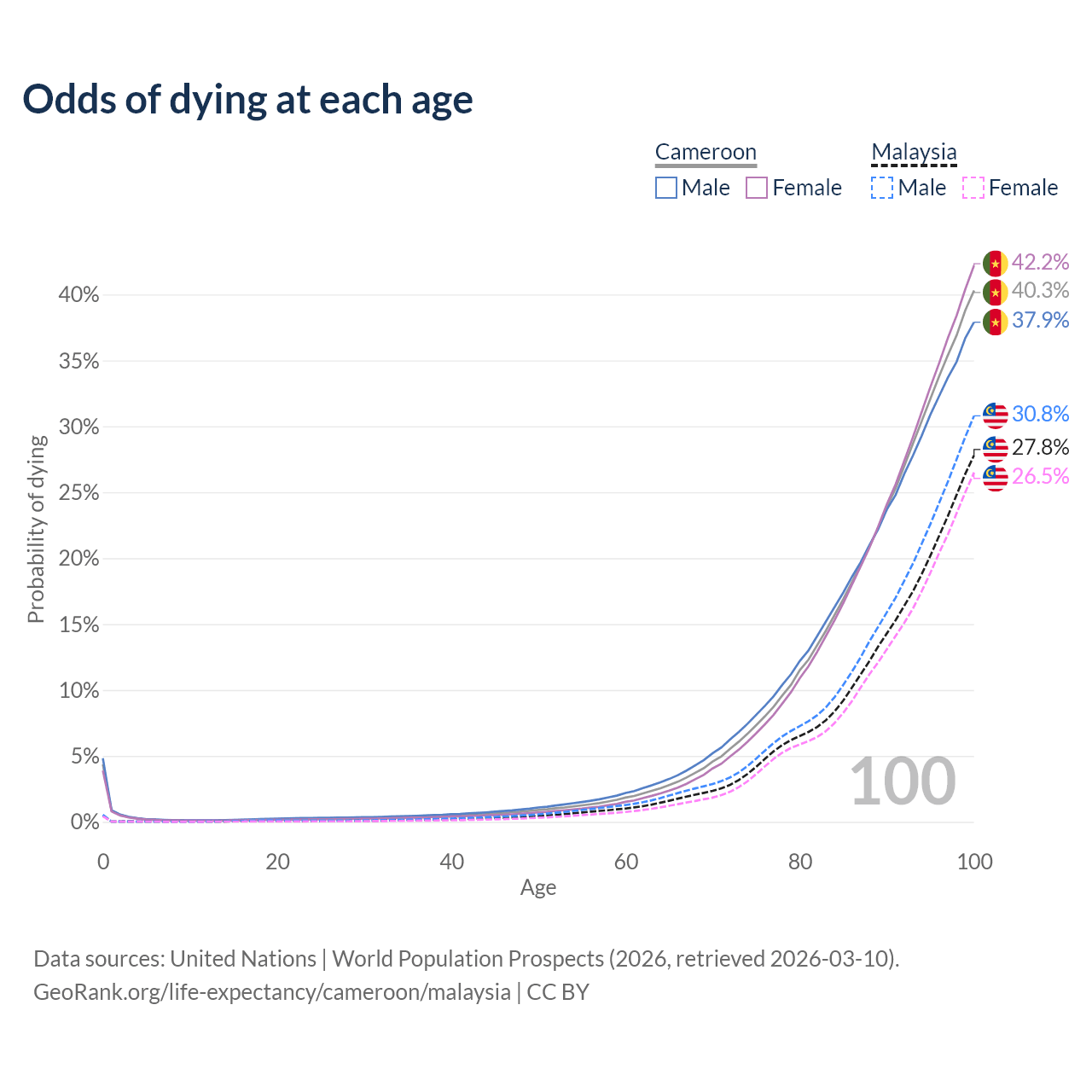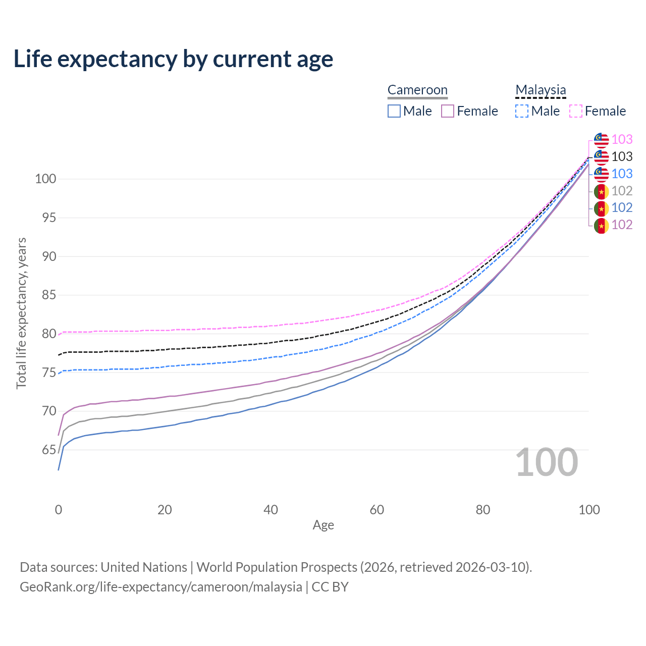 This life expectancy calculator shows the odds of living to 100, 95, 90, and below based on current age for both males and females in Cameroon and Malaysia, along with mean and median age of death. The calculations are based on the 2026 life tables (actuarial tables) from the UN World Population Prospects.