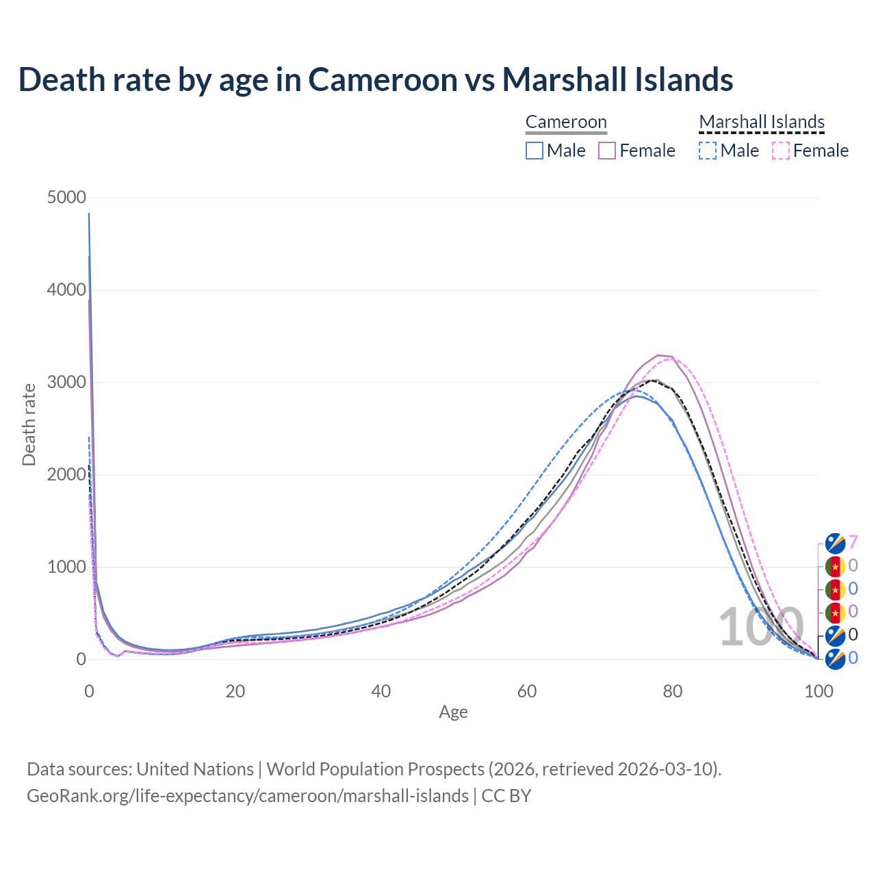 In Cameroon, the most common age of death is 0, compared to 77 in the Marshall Islands. The median age of death is 71.6 in Cameroon and 72 in the Marshall Islands, meaning only half of each cohort is expected to live past that age.