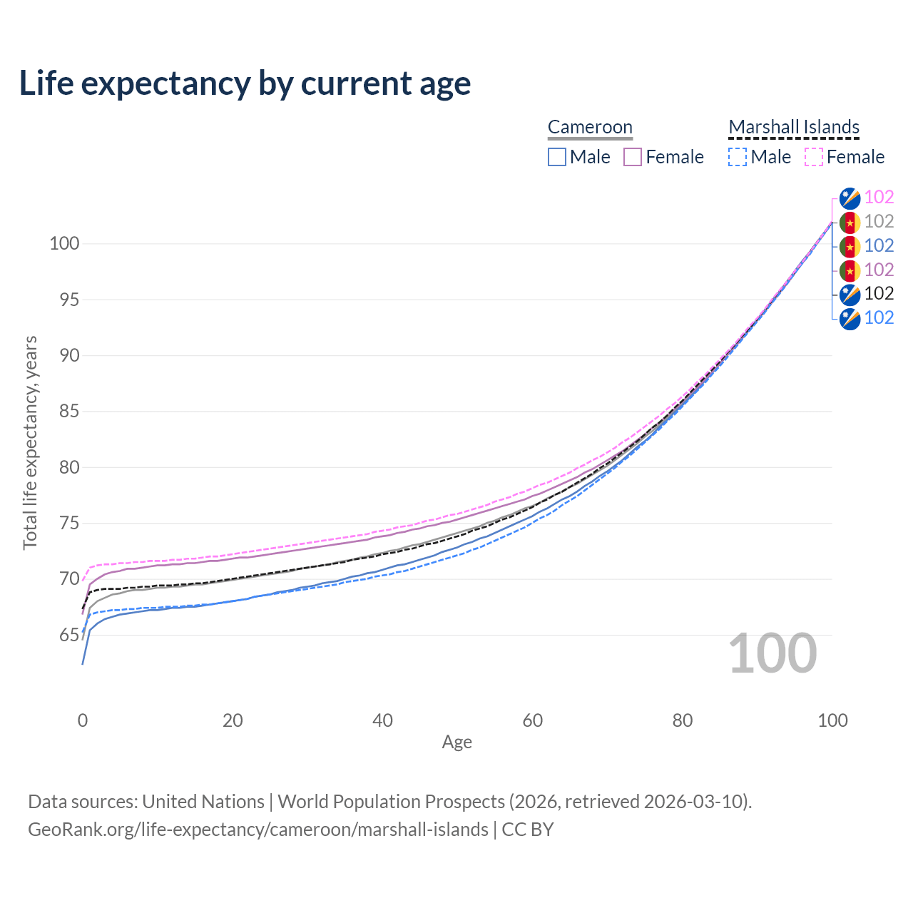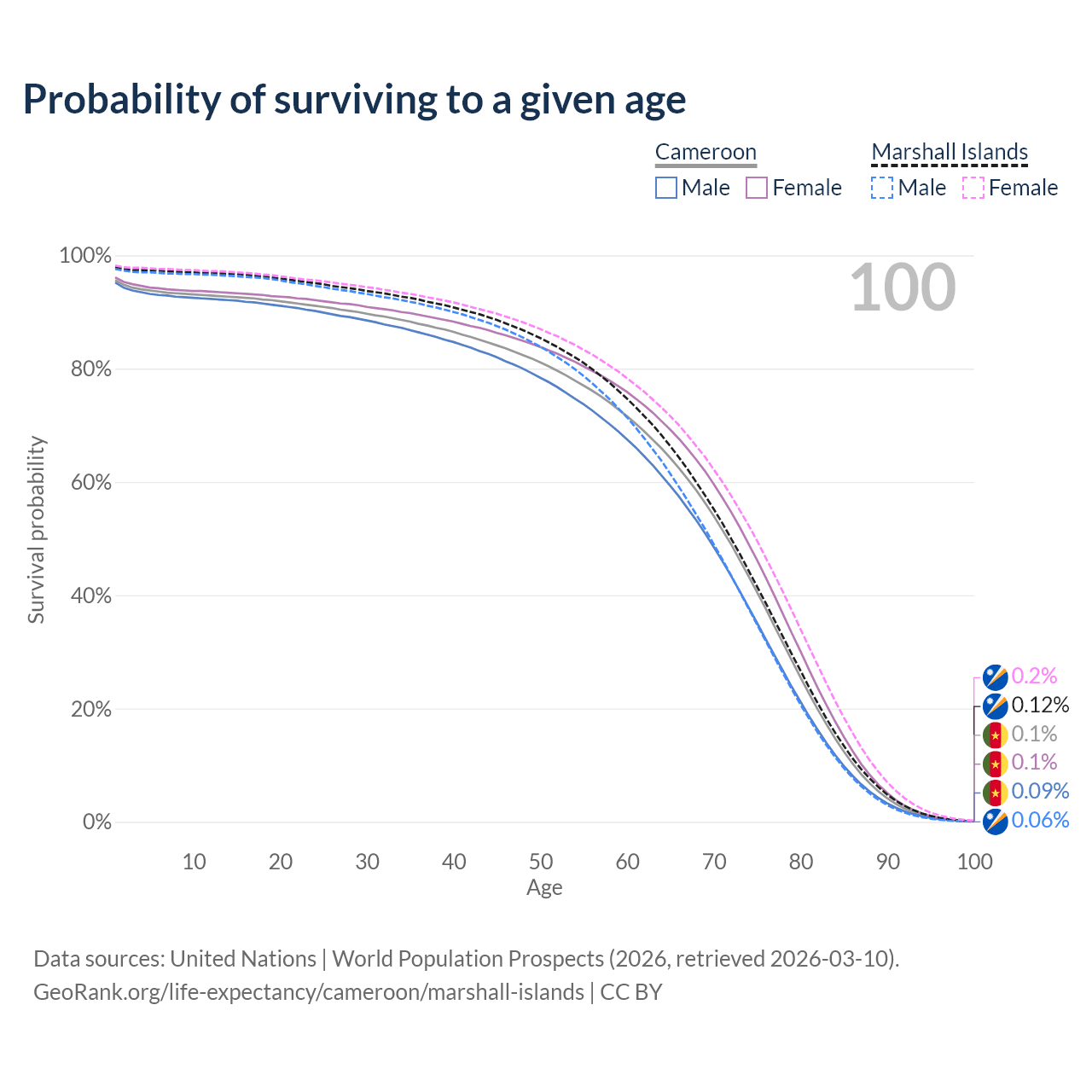 This life expectancy calculator shows the odds of living to 100, 95, 90, and below based on current age for both males and females in Cameroon and the Marshall Islands, along with mean and median age of death. The calculations are based on the 2026 life tables (actuarial tables) from the UN World Population Prospects.