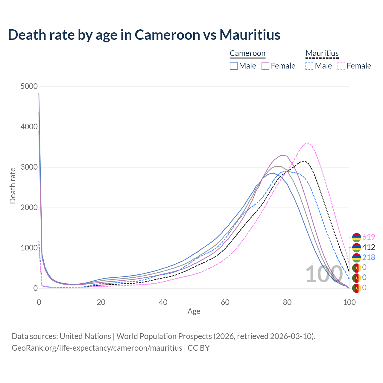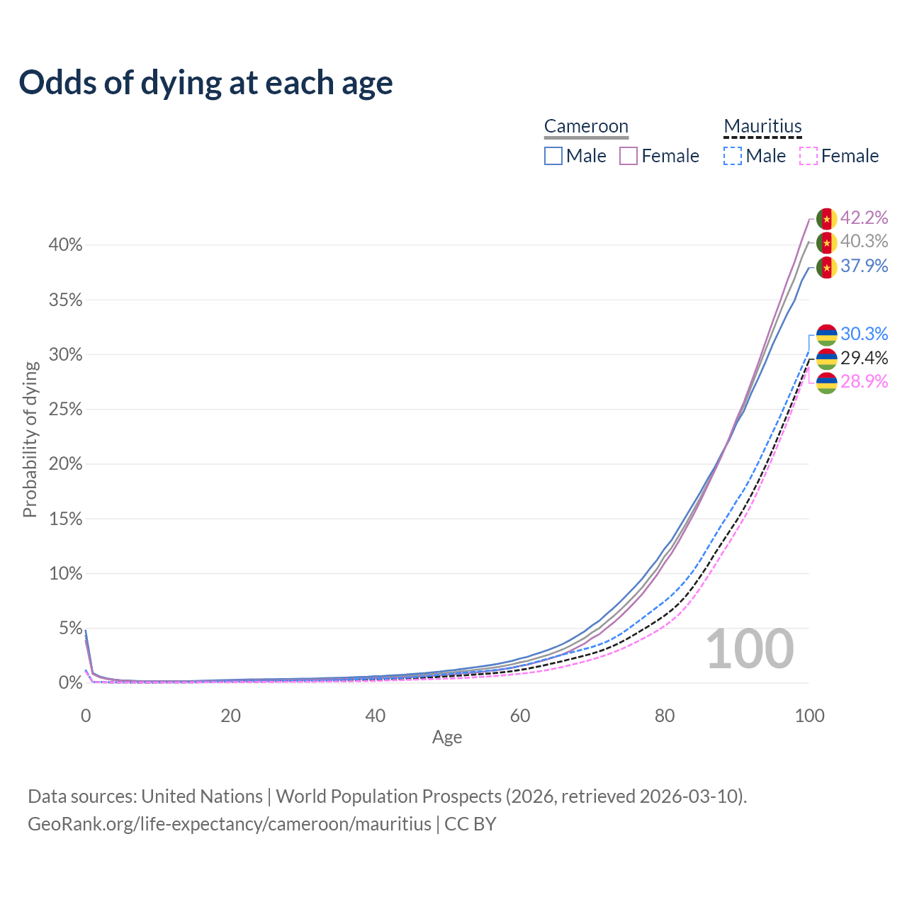 This life expectancy calculator shows the odds of living to 100, 95, 90, and below based on current age for both males and females in Cameroon and Mauritius, along with mean and median age of death. The calculations are based on the 2026 life tables (actuarial tables) from the UN World Population Prospects.