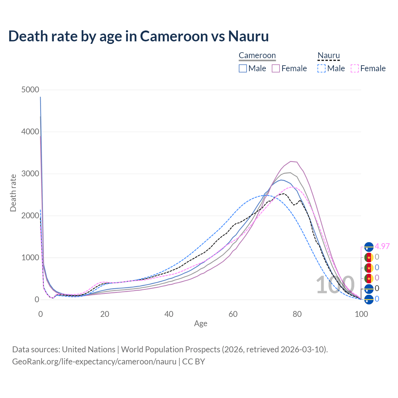 In Cameroon, the most common age of death is 0, compared to 76 in Nauru. The median age of death is 71.6 in Cameroon and 67.3 in Nauru, meaning only half of each cohort is expected to live past that age.