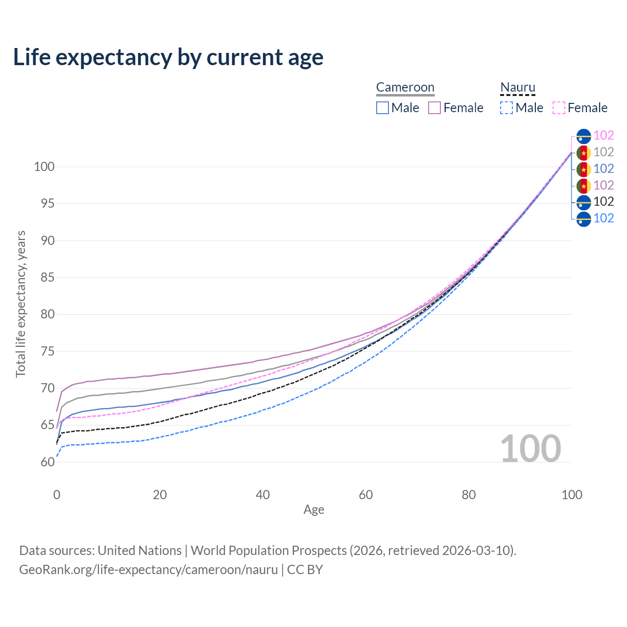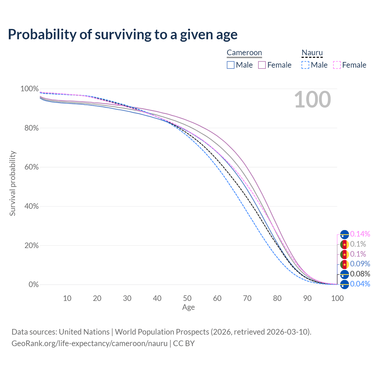 This life expectancy calculator shows the odds of living to 100, 95, 90, and below based on current age for both males and females in Cameroon and Nauru, along with mean and median age of death. The calculations are based on the 2026 life tables (actuarial tables) from the UN World Population Prospects.