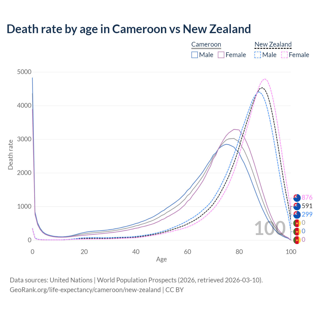 In Cameroon, the most common age of death is 0, compared to 89 in New Zealand. The median age of death is 71.6 in Cameroon and 85.8 in New Zealand, meaning only half of each cohort is expected to live past that age.