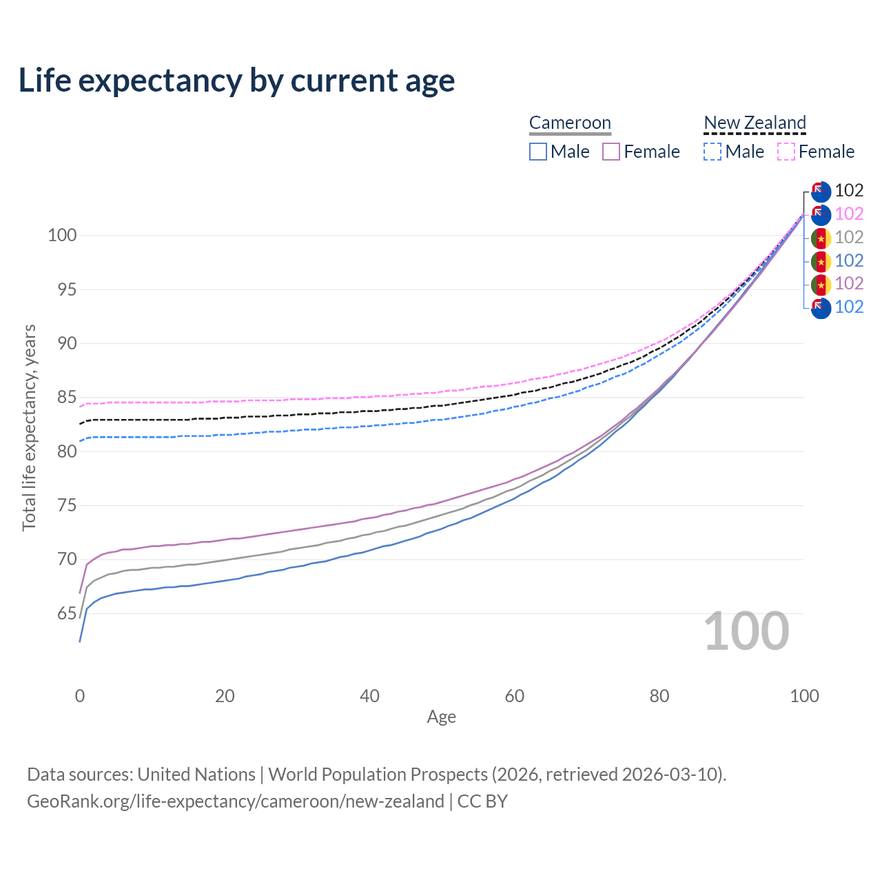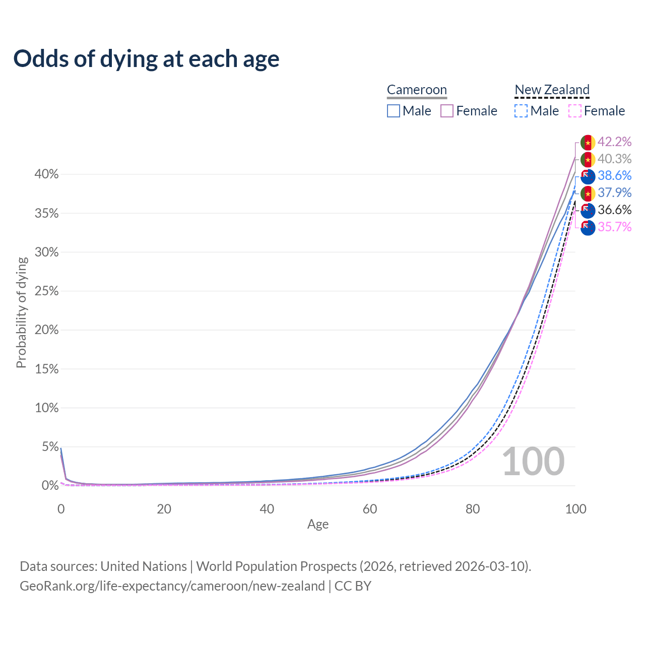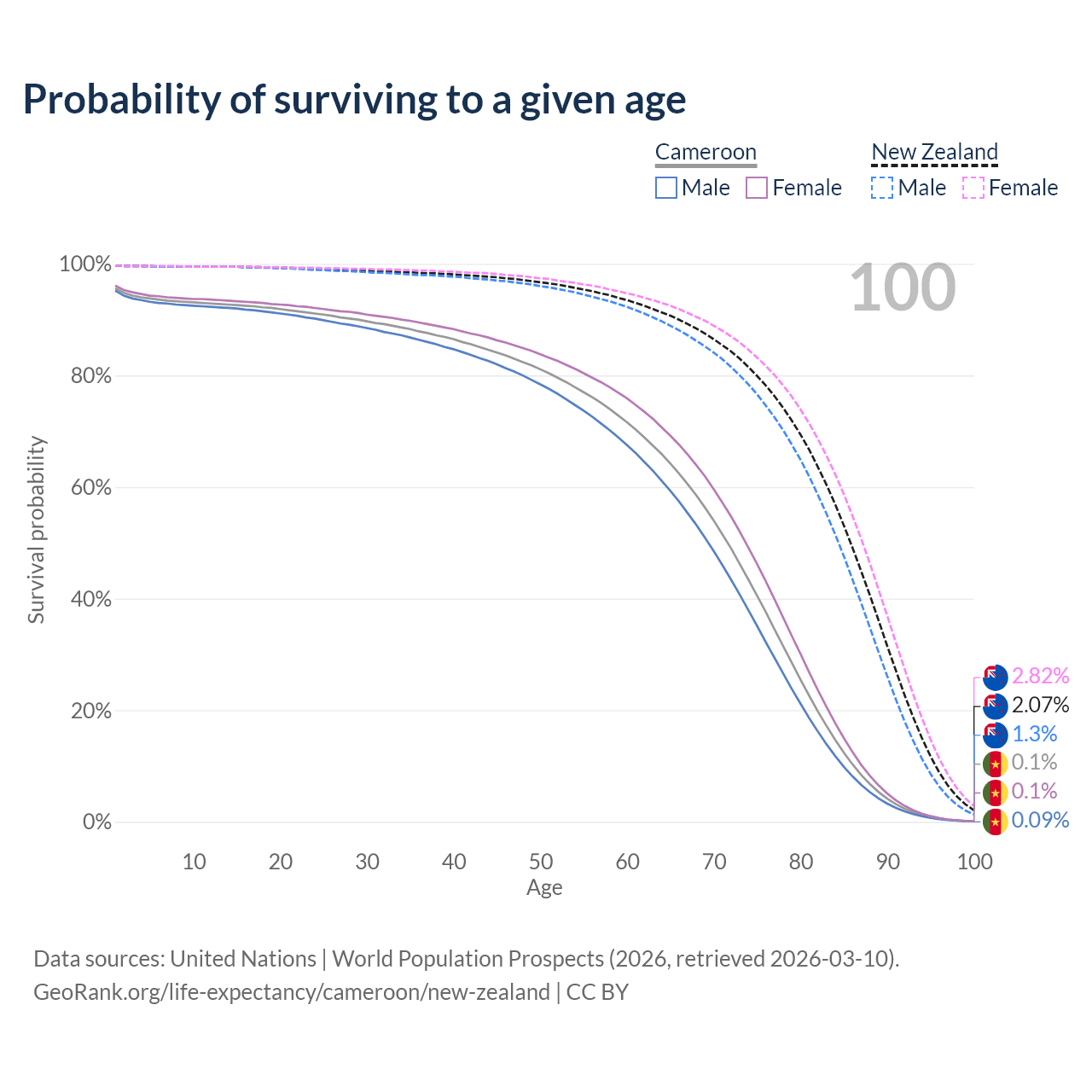 This life expectancy calculator shows the odds of living to 100, 95, 90, and below based on current age for both males and females in Cameroon and New Zealand, along with mean and median age of death. The calculations are based on the 2026 life tables (actuarial tables) from the UN World Population Prospects.