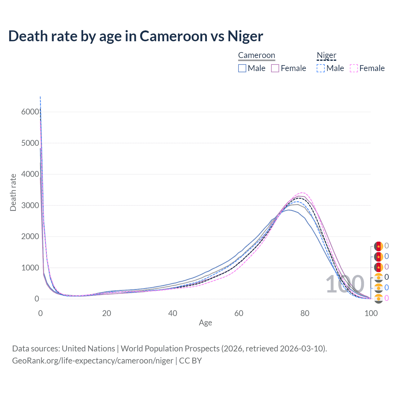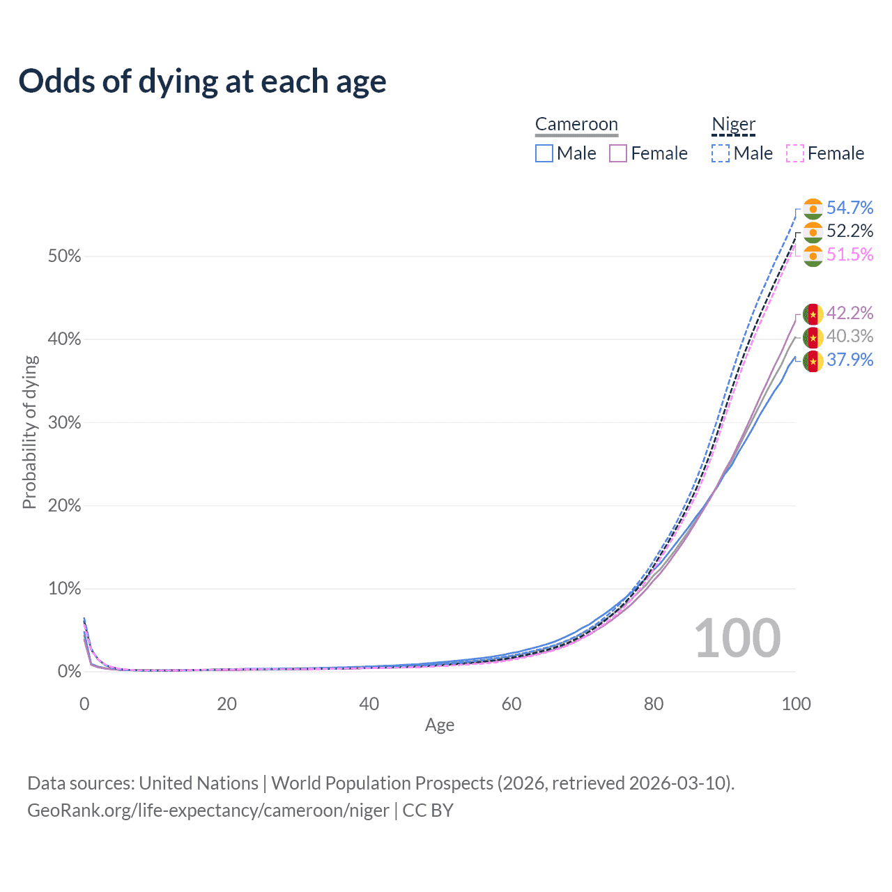 This life expectancy calculator shows the odds of living to 100, 95, 90, and below based on current age for both males and females in Cameroon and Niger, along with mean and median age of death. The calculations are based on the 2026 life tables (actuarial tables) from the UN World Population Prospects.