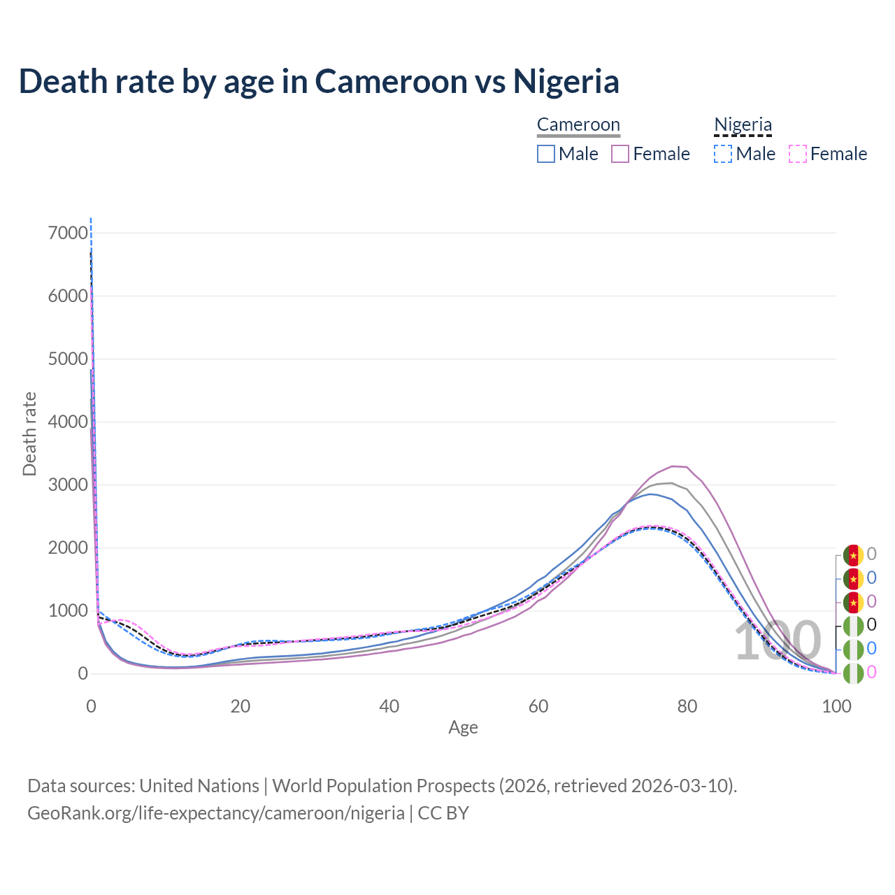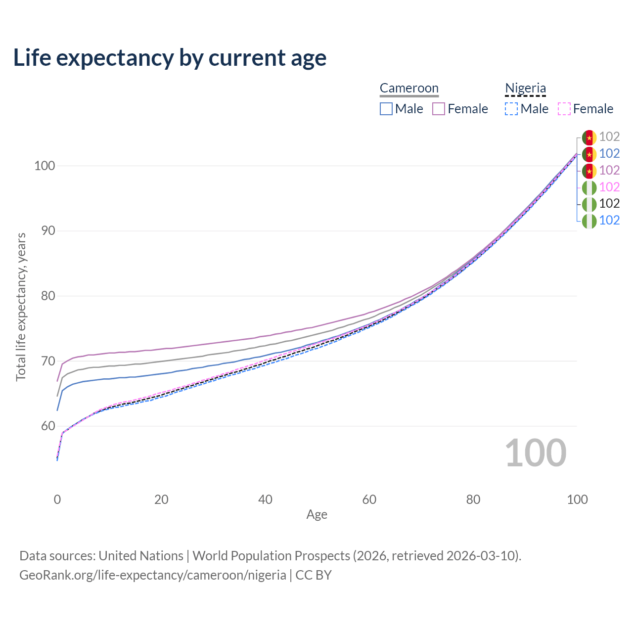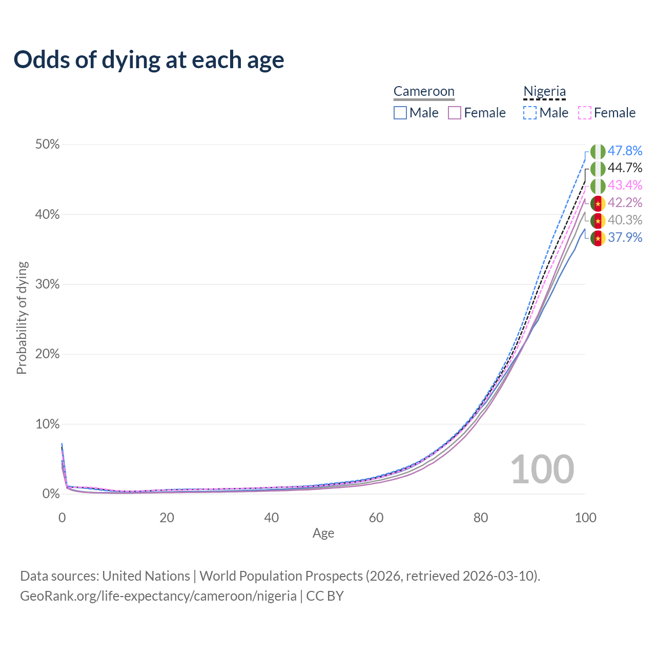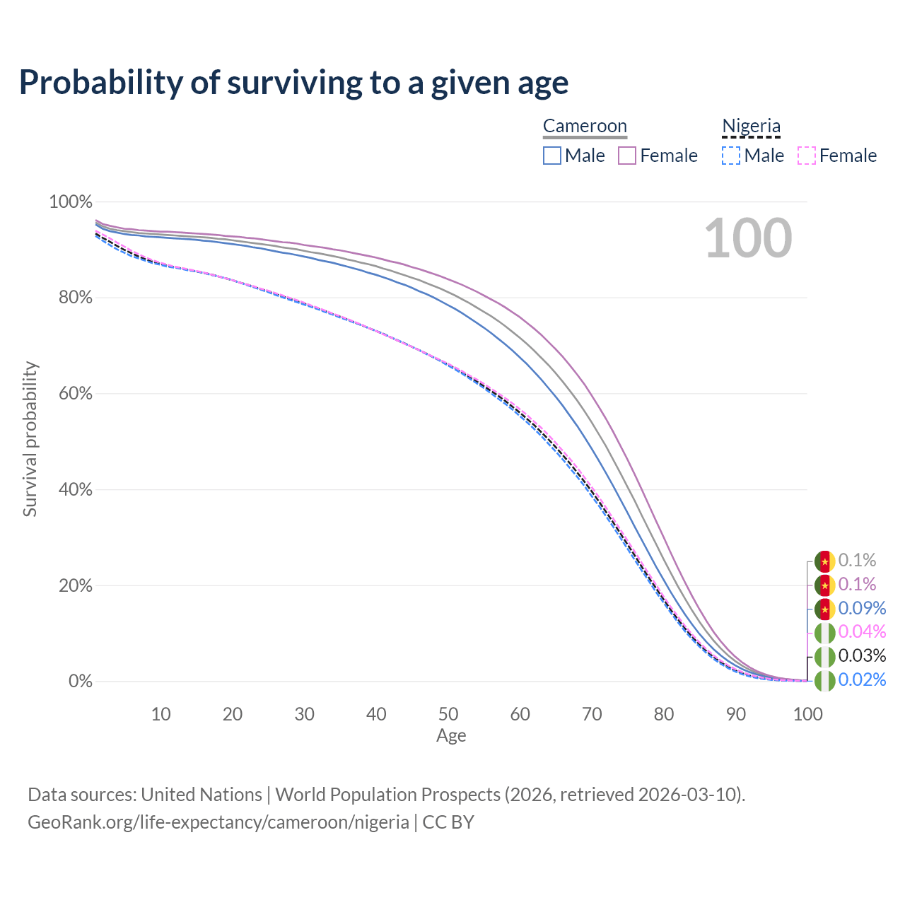 This life expectancy calculator shows the odds of living to 100, 95, 90, and below based on current age for both males and females in Cameroon and Nigeria, along with mean and median age of death. The calculations are based on the 2026 life tables (actuarial tables) from the UN World Population Prospects.