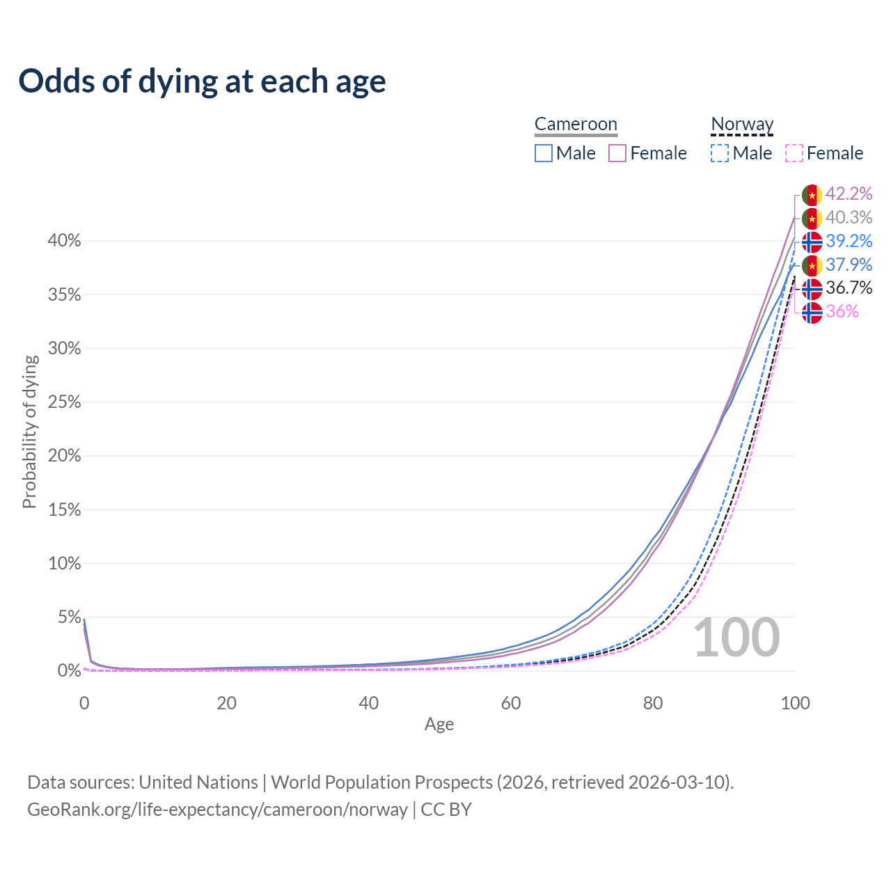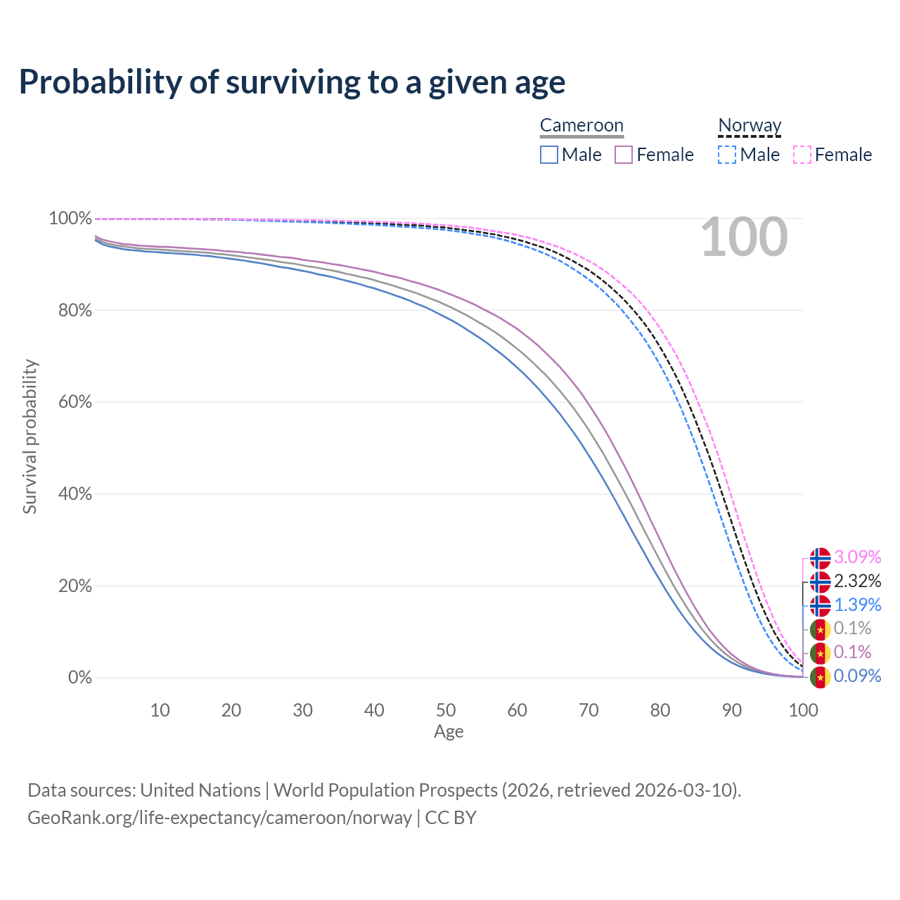 This life expectancy calculator shows the odds of living to 100, 95, 90, and below based on current age for both males and females in Cameroon and Norway, along with mean and median age of death. The calculations are based on the 2026 life tables (actuarial tables) from the UN World Population Prospects.