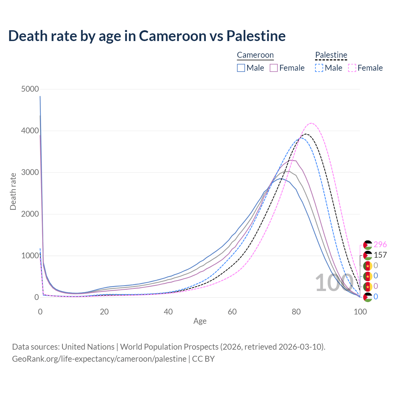 In Cameroon, the most common age of death is 0, compared to 83 in Palestine. The median age of death is 71.6 in Cameroon and 80.5 in Palestine, meaning only half of each cohort is expected to live past that age.